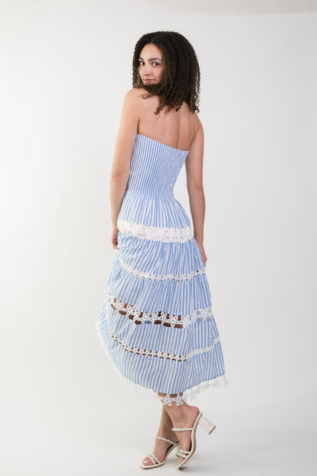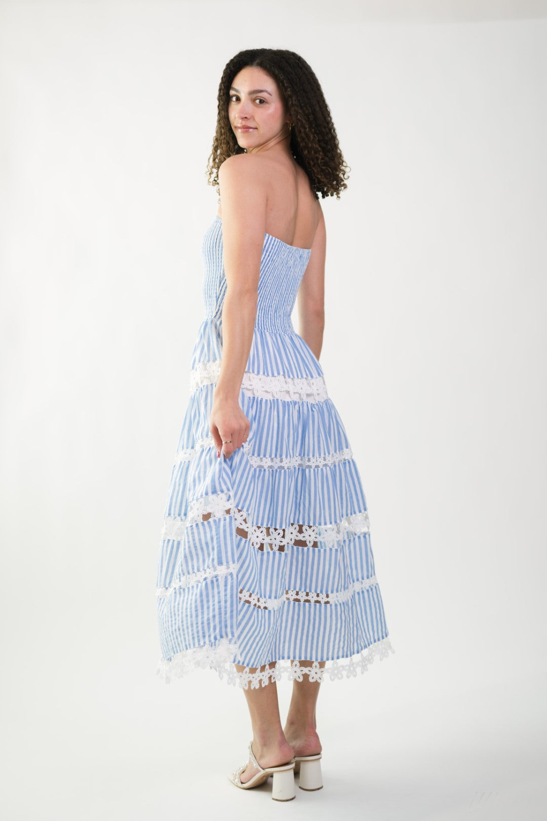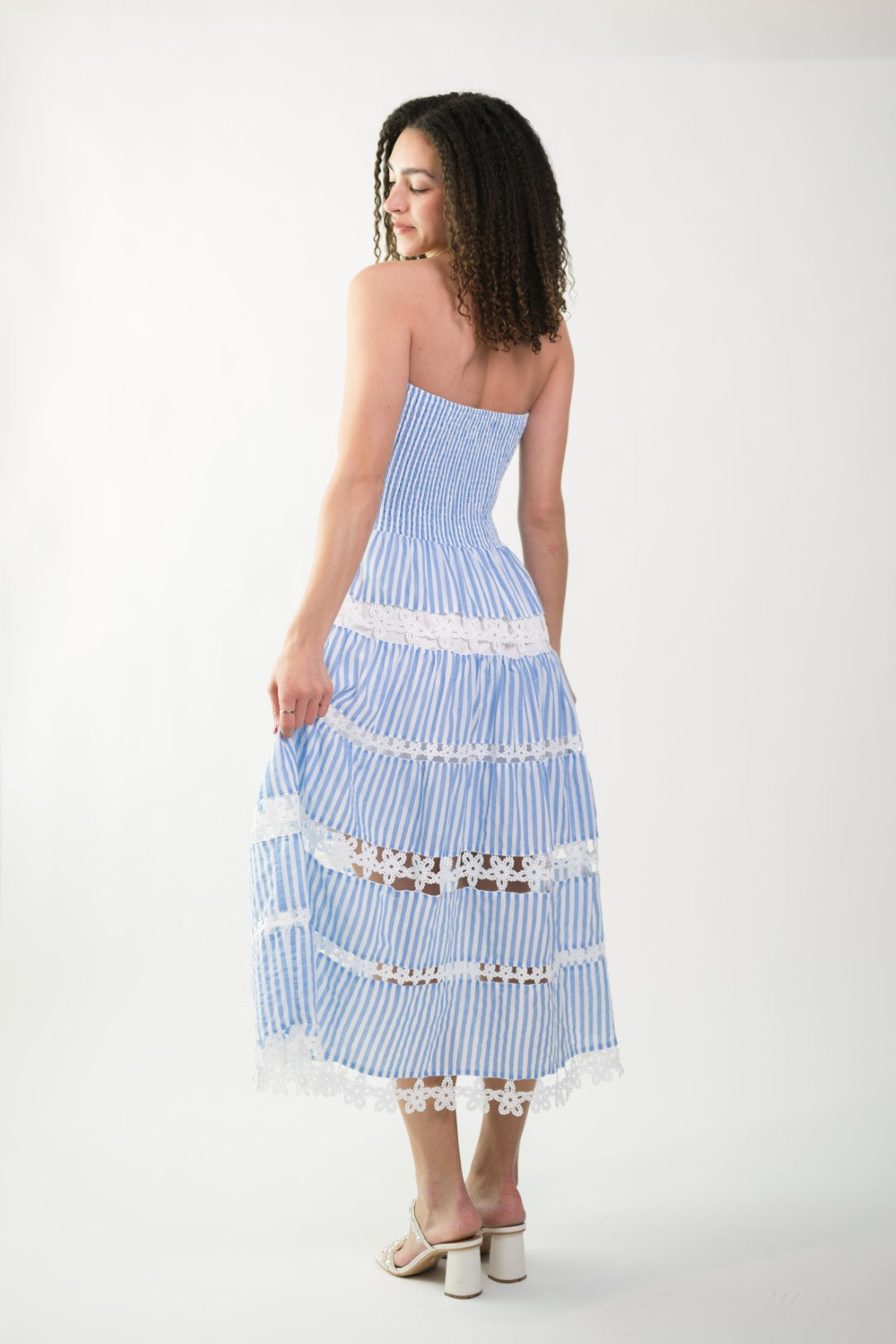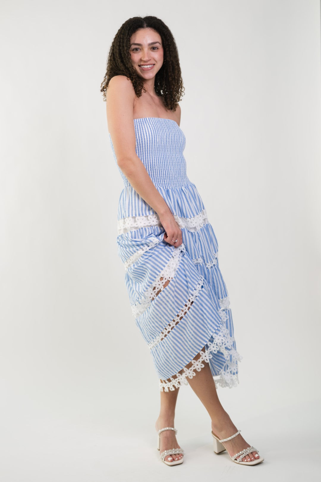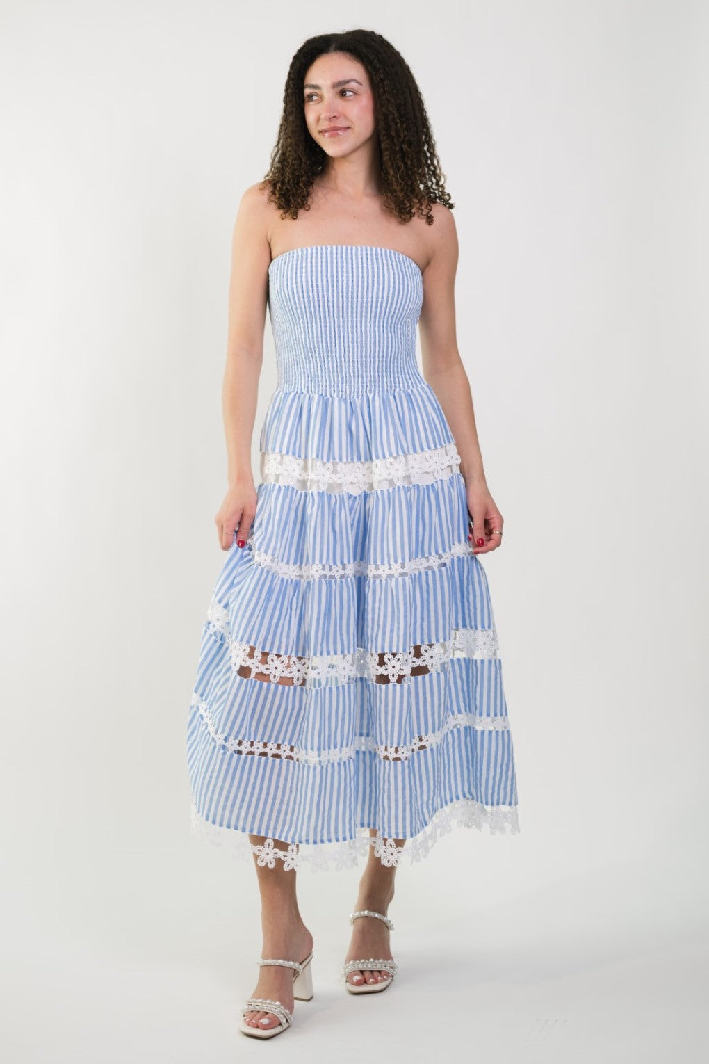 The Jolene Eyelet Lace Tube Dress is seriously everything your spring wardrobe needs! This gorgeous sky blue and white striped midi features the prettiest smocked bodice that hugs in all the right places and the most amazing eyelet lace trim between each tier. The strapless design gives those perfect vacation vibes while still feeling totally wearable.