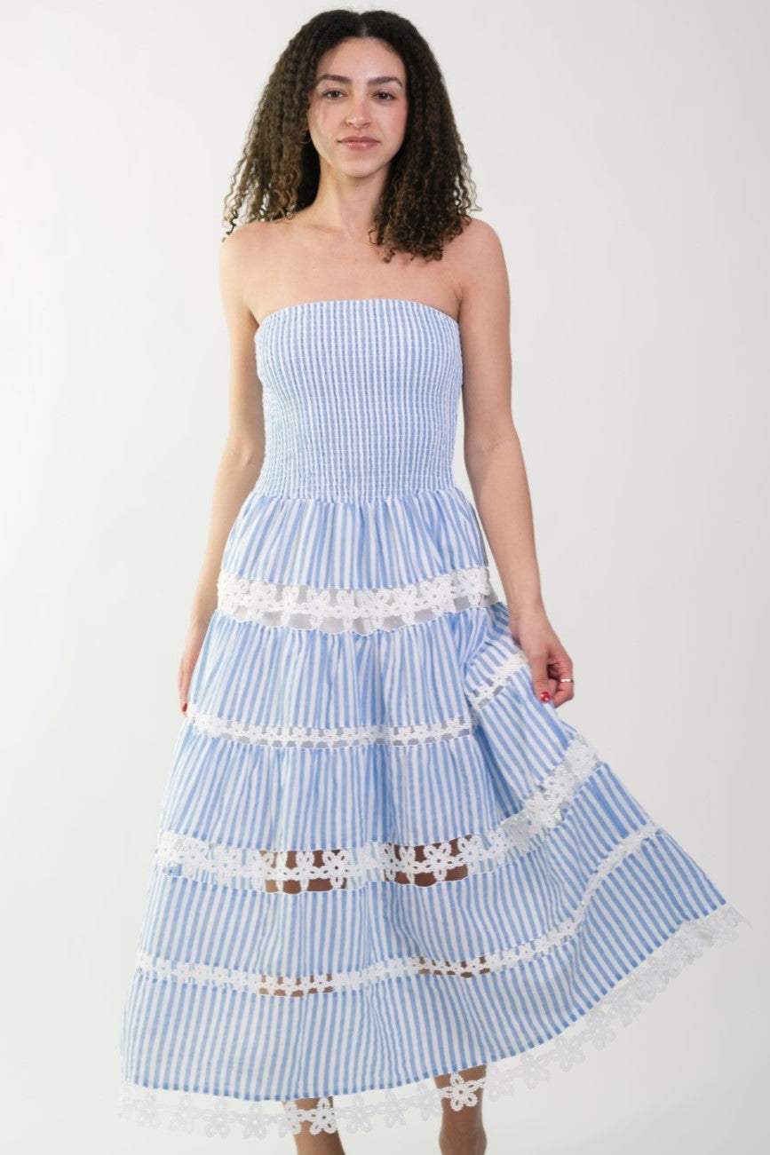 Jolene Eyelet Lace Tube Dress - Striped Blue
