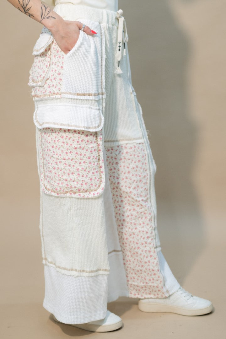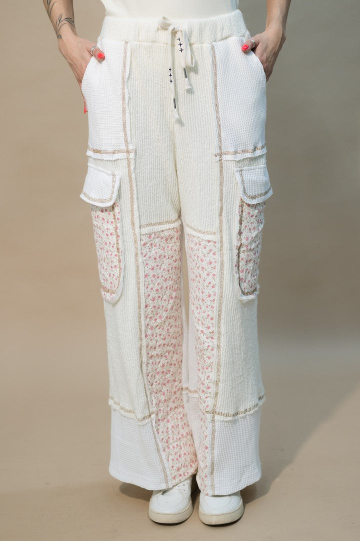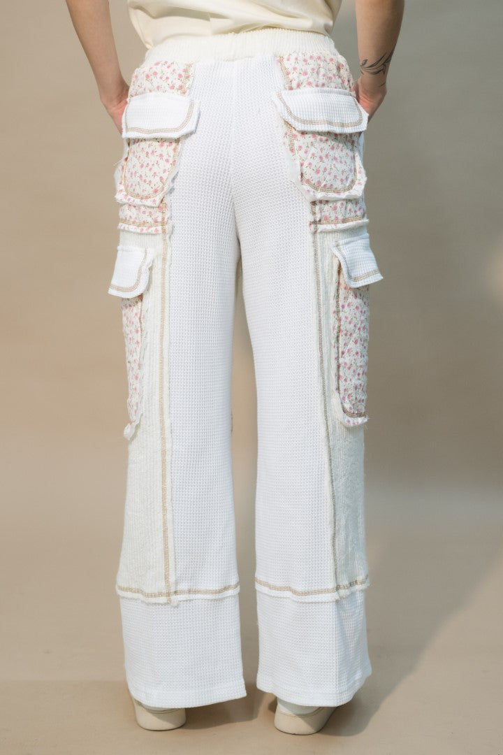 Cream mixed-texture cargo-style pants