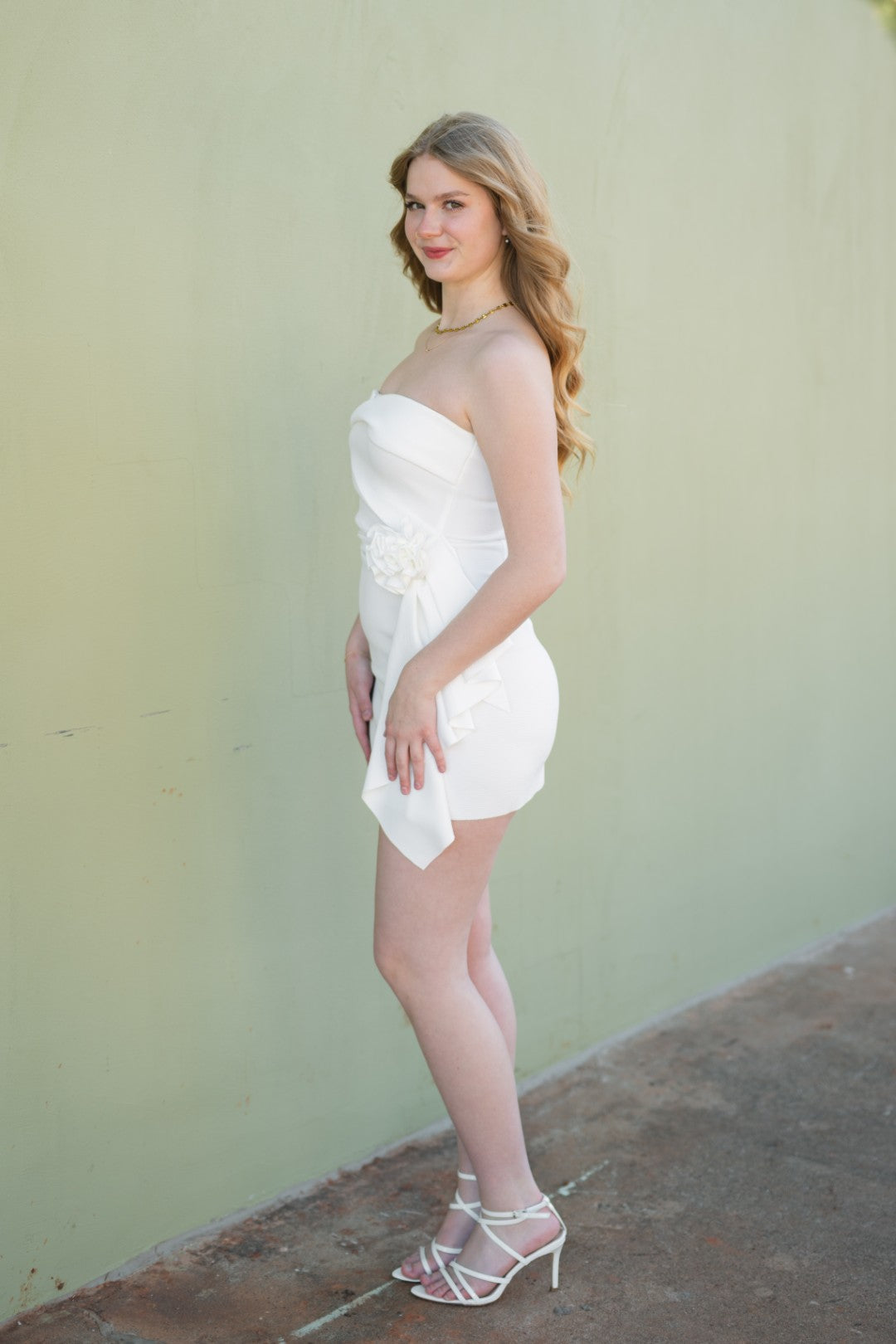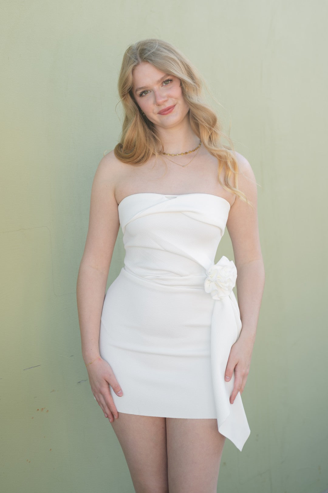 The Opal Tube Mini Dress is a structured strapless mini designed with soft draping across the bodice and a statement floral detail at the waist. The tailored silhouette creates a flattering, sculpted fit, while the hidden back zipper keeps the look clean and secure. Perfect for bridal events, graduation, spring formals, or any occasion that calls for a polished white mini.