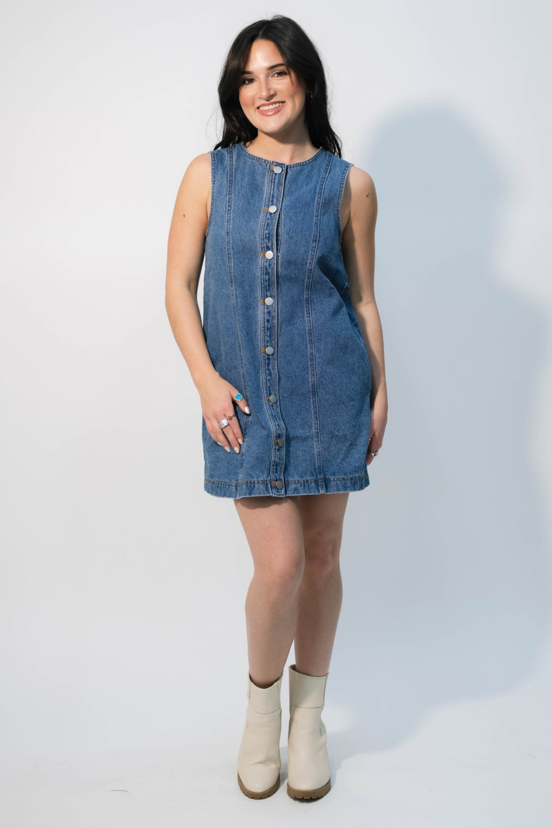 The Addison Sleeveless Denim Dress is a modern nod to vintage Americana — simple, flattering, and endlessly versatile. Crafted from medium-wash denim, this dress features a front button-down design, a straight neckline, and subtle seaming that elongates the silhouette. Side pockets add a touch of functionality, while the structured shape keeps it effortlessly polished.