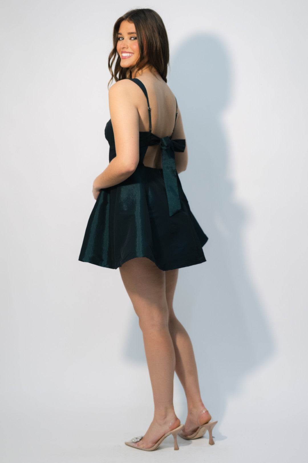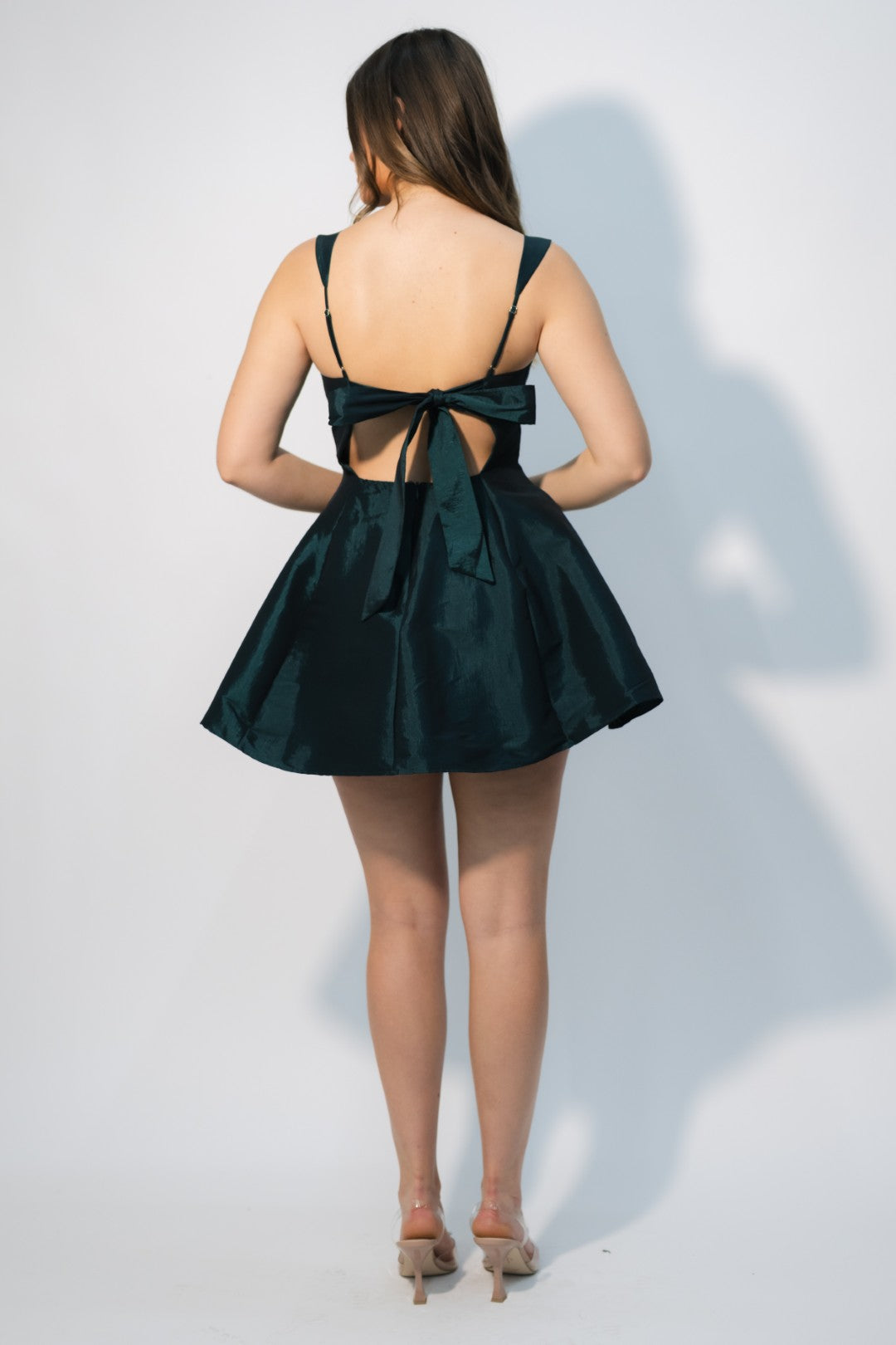 The Candace Mini Dress – Hunter Green is the perfect mix of flirty and sophisticated. Designed in a rich, iridescent hunter green fabric, this mini features a structured square neckline, a fitted bodice, and a playful flared skirt that moves beautifully. The open back with a statement bow adds just the right amount of drama for the holiday season.