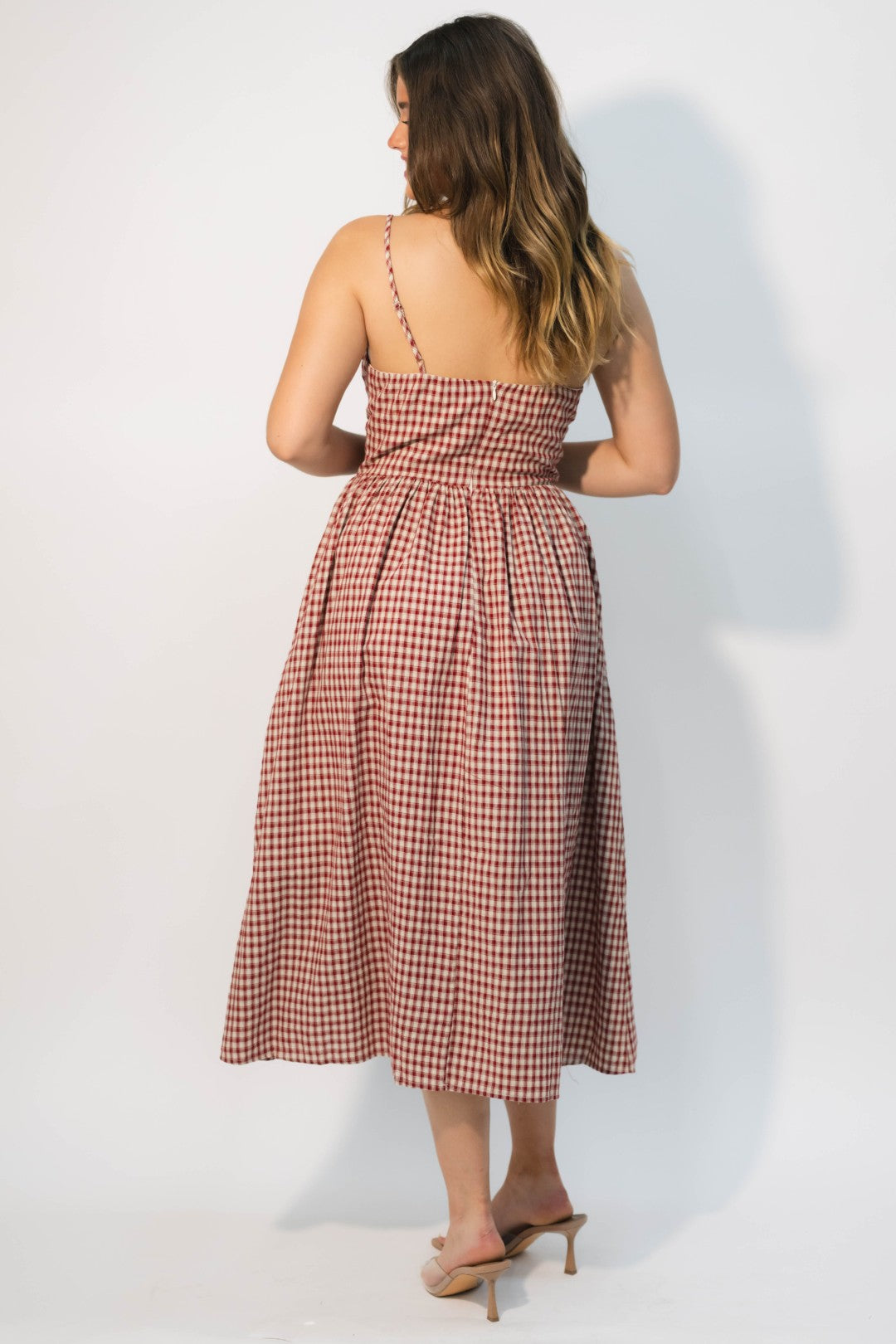 Sweet, simple, and oh-so-charming, the Hazelwood Gingham Midi Dress captures that perfect blend of vintage romance and effortless ease. The soft red-and-cream gingham print pairs with a dainty lace-trim neckline and subtle bow detail, giving it that nostalgic, countryside-picnic appeal. The fitted bodice flatters the waist before falling into a full, softly gathered skirt that sways with every step — and yes, it has pockets.
