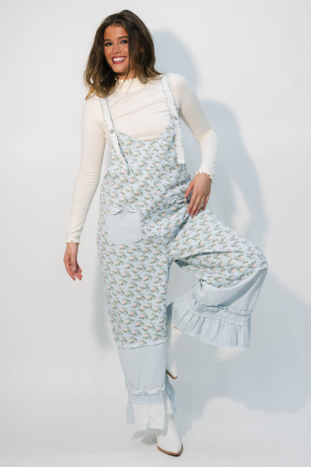 A little vintage, a little cottage-core, and a lot of cozy charm, the Remi Denim Overall Jumpsuit brings easygoing fall layering to life. This soft blue denim style features a dainty floral print, adjustable tie straps, and roomy patch pockets for that effortless, artsy feel. The ruffled hem detail adds a touch of femininity, while the relaxed fit makes it perfect for casual days that still call for a cute outfit moment.