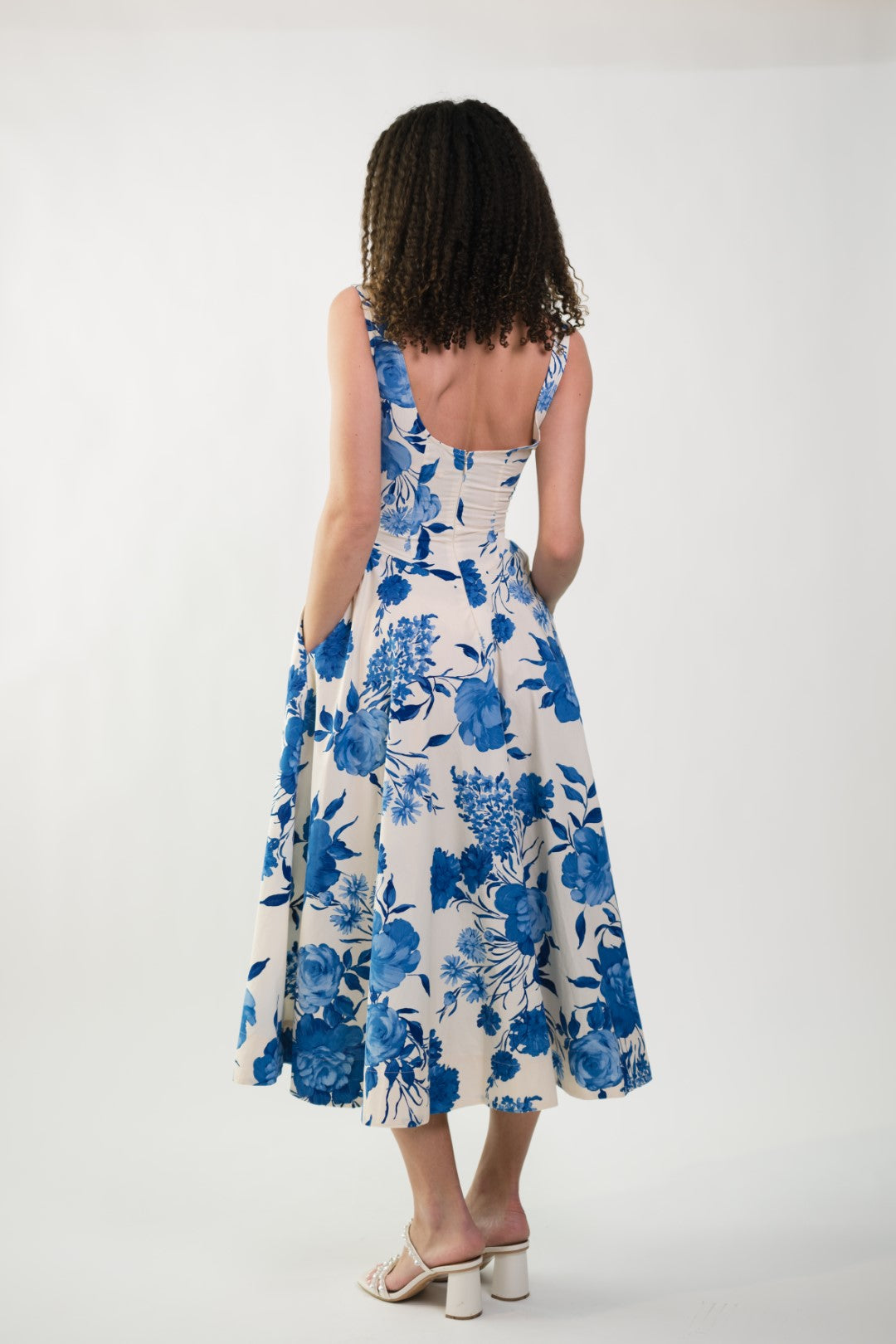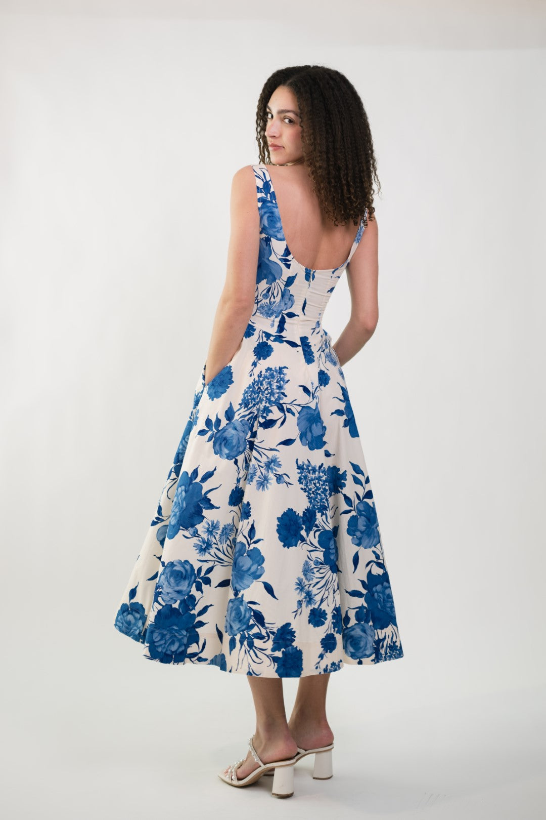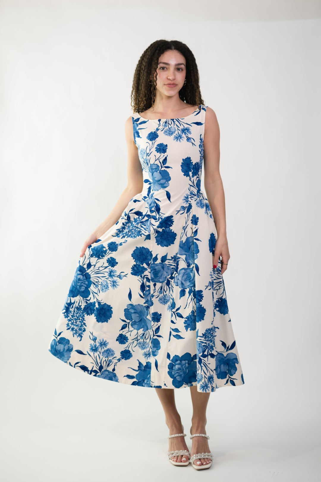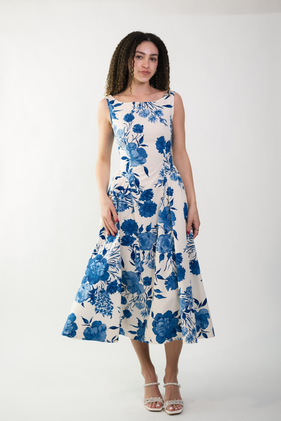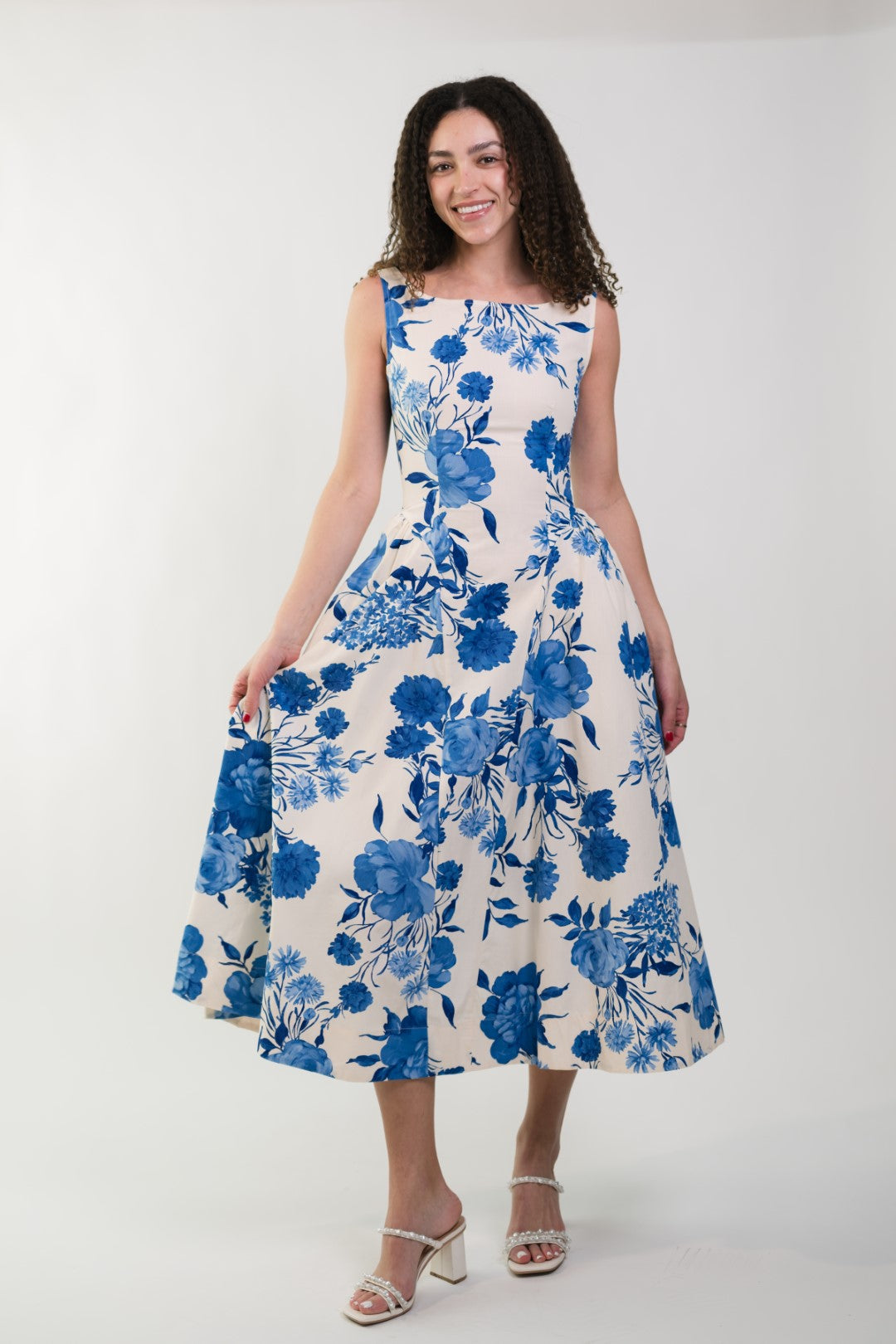 The Jillian Boat Neck Midi Dress is a timeless dress designed with effortless elegance in mind. Featuring a classic boat neckline and a flattering low scoop back, this piece feels both refined and feminine. The crisp white base is paired with soft blue florals, creating a romantic look perfect for the season. A hidden back zipper ensures a smooth, tailored fit while maintaining the clean lines of the silhouette. Ideal for brunches, bridal events, garden parties, or warm-weather occasions.