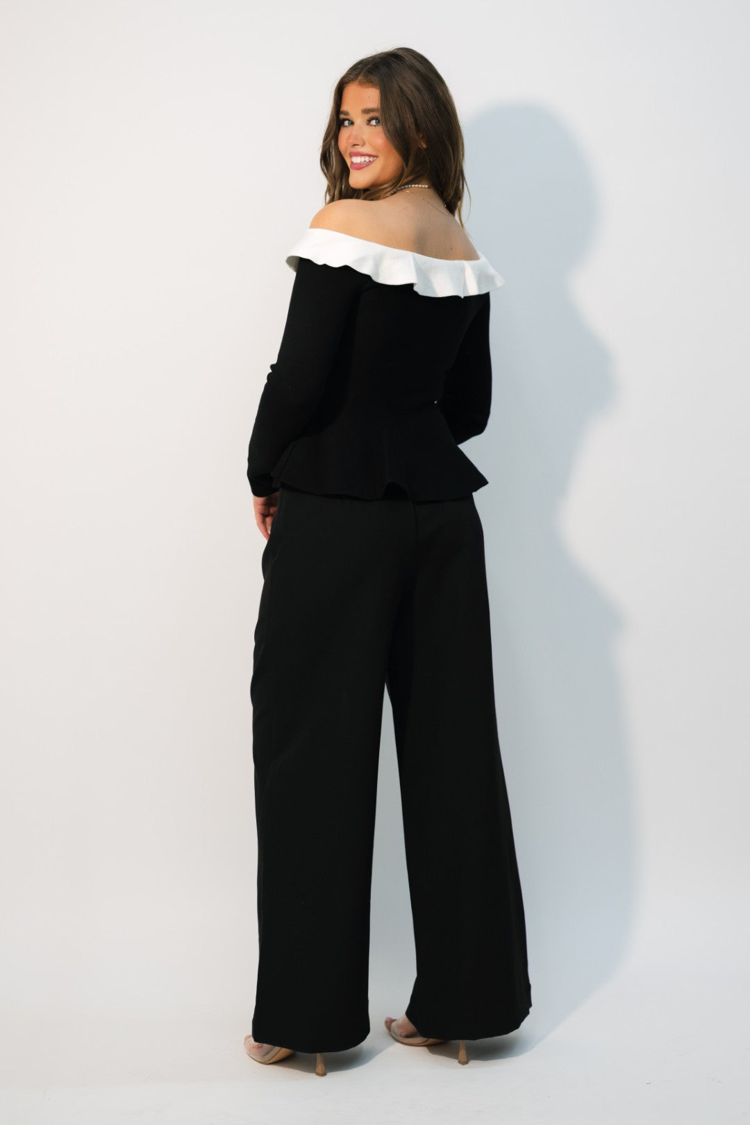 Classic meets modern with the Essie Peplum Top. This off-the-shoulder style is designed in black with a striking white ruffle neckline, making it both bold and feminine. Gold button details down the front add a polished finish, while the fitted bodice and flared peplum hem create a flattering silhouette that highlights the waist. It’s a versatile piece that brings a little sophistication to your everyday wardrobe.