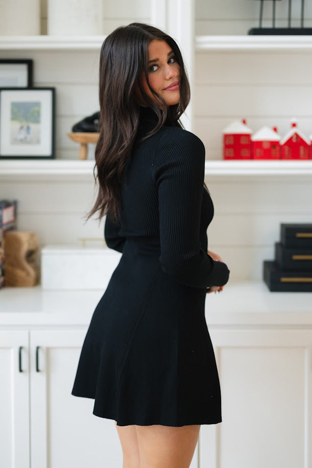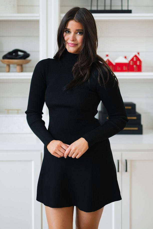 The Arya Sweater Dress – Black is a sleek, minimalist essential with a refined ribbed knit and subtly flared skirt. Its long sleeves and mock neckline create a polished silhouette that transitions seamlessly from daytime outings to evening gatherings. Effortless to style, this classic black dress pairs beautifully with heels, boots, or statement accessories for a clean, elevated look.