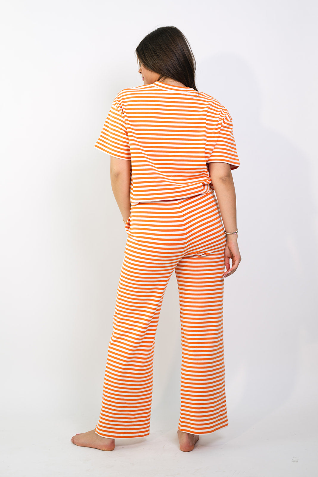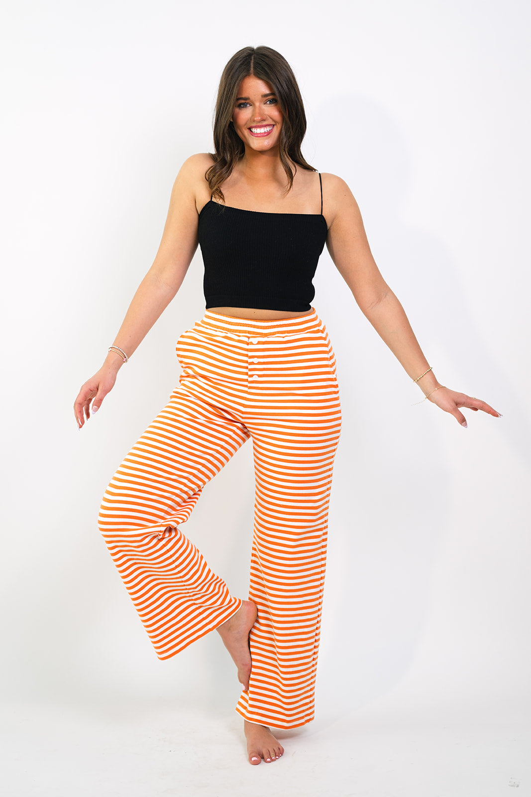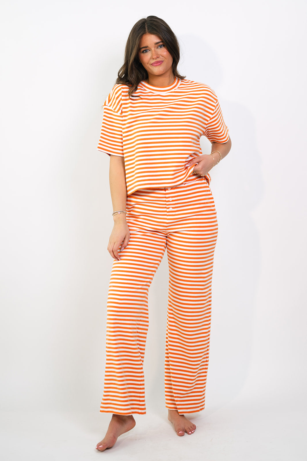 The Belle Orange Stripe Pants are a fun, relaxed wide-leg pant that pairs seamlessly with the Belle top as a coordinated set or can easily be styled on their own with a fitted white tee or tank. The elastic waistband and roomy fit make them incredibly comfortable while still looking intentional and put-together. They have a slight retro feel that works perfectly for spring brunches, weekend trips, or anywhere you want a casual-cool outfit with minimal effort.