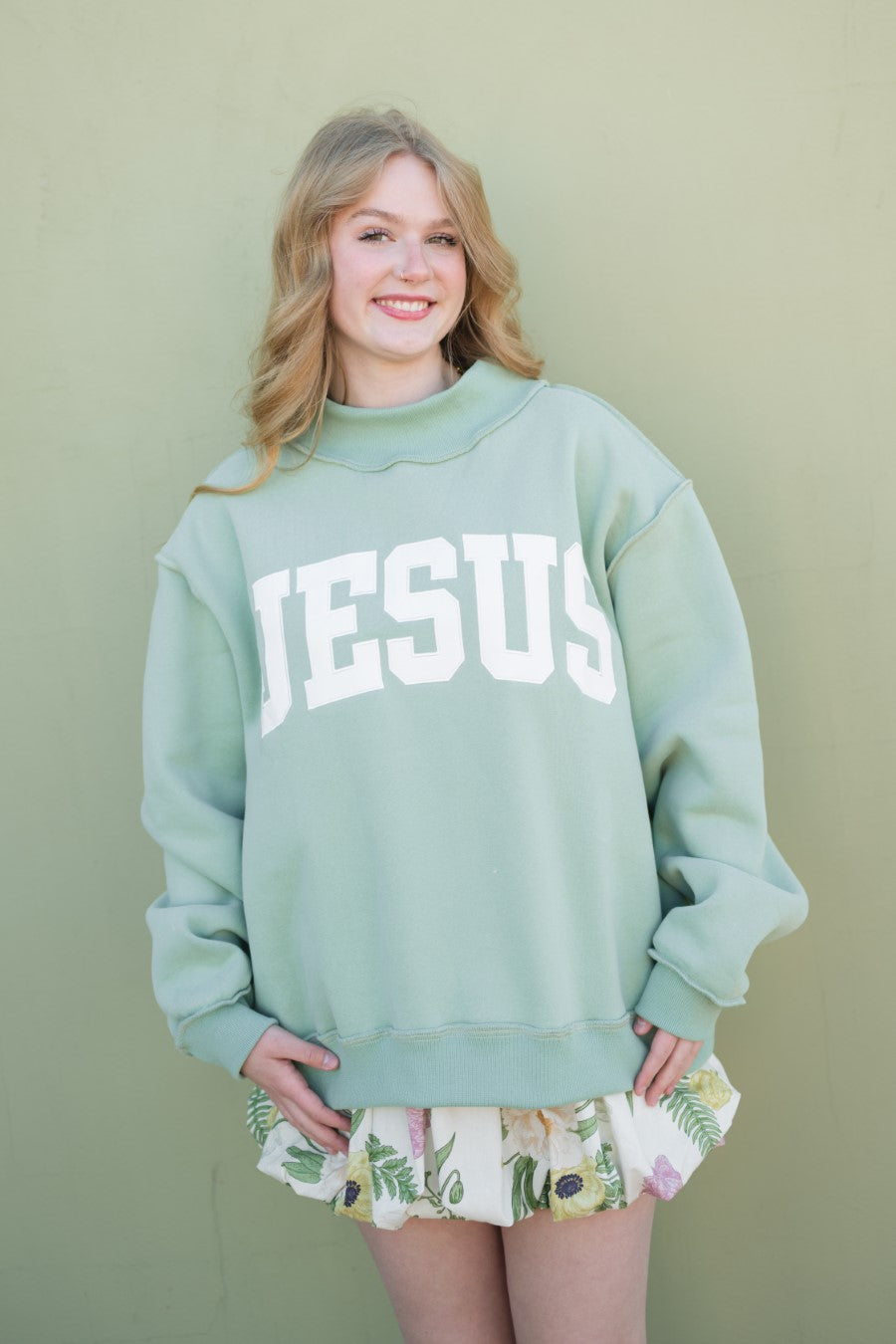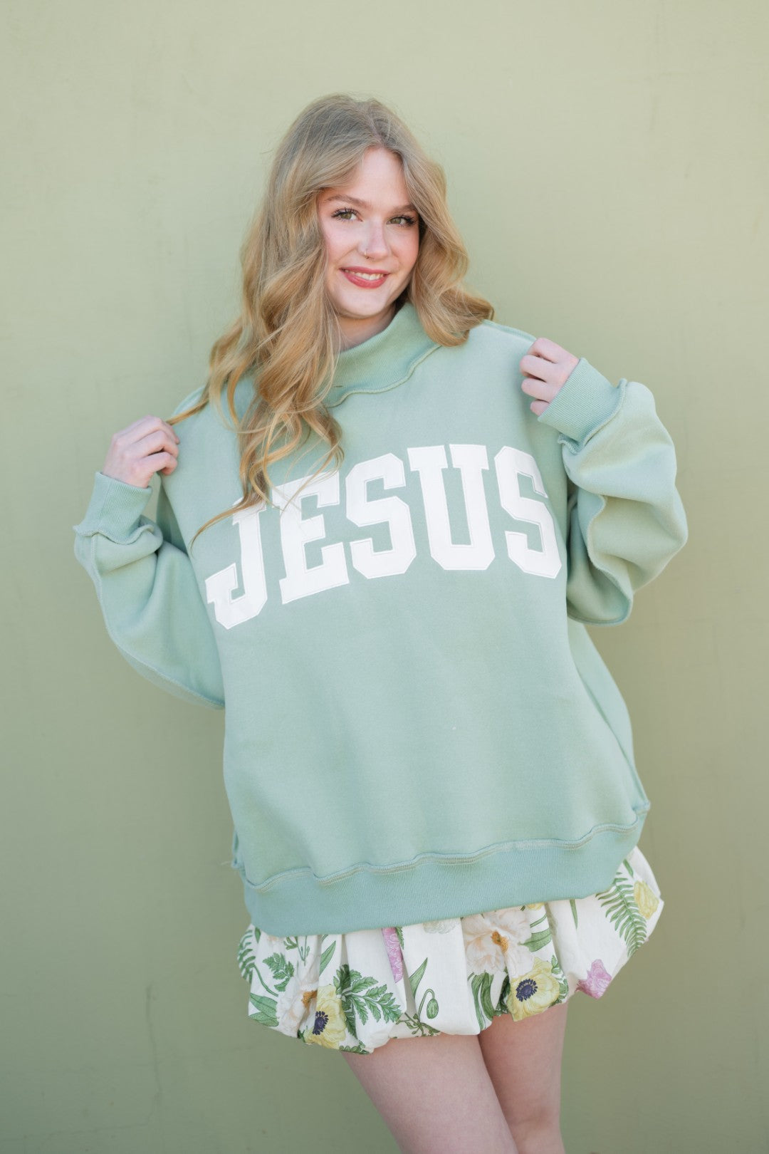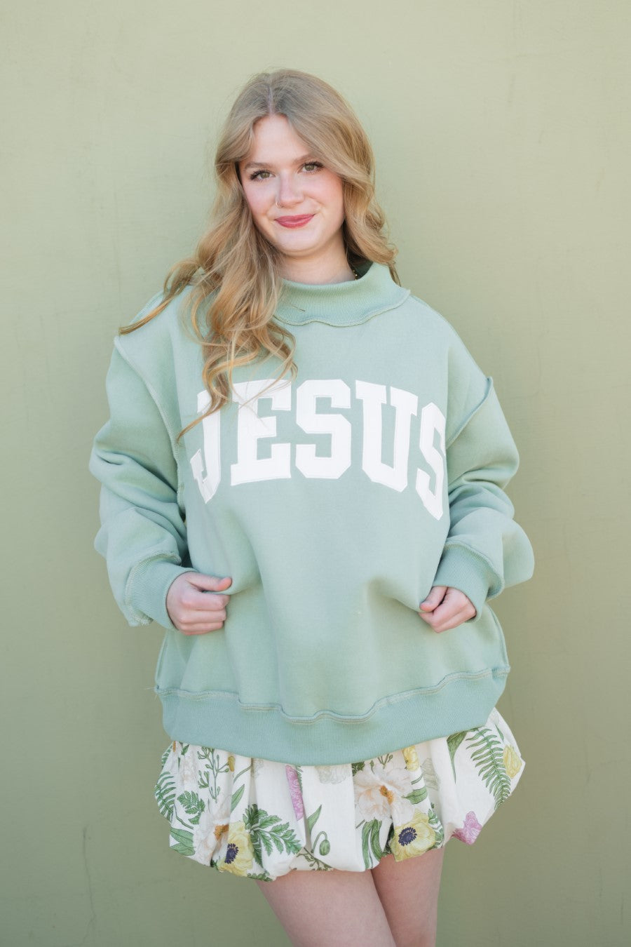 The "Jesus" Mock Neck Sweatshirt is that effortlessly cozy piece you’ll keep reaching for. In a soft light green it’s simple, meaningful, and easy to style. The oversized fit and mock neck give it a relaxed, lived-in feel, while the ultra-soft interior keeps you warm and comfortable all day. Easy to wear. Easy to love.