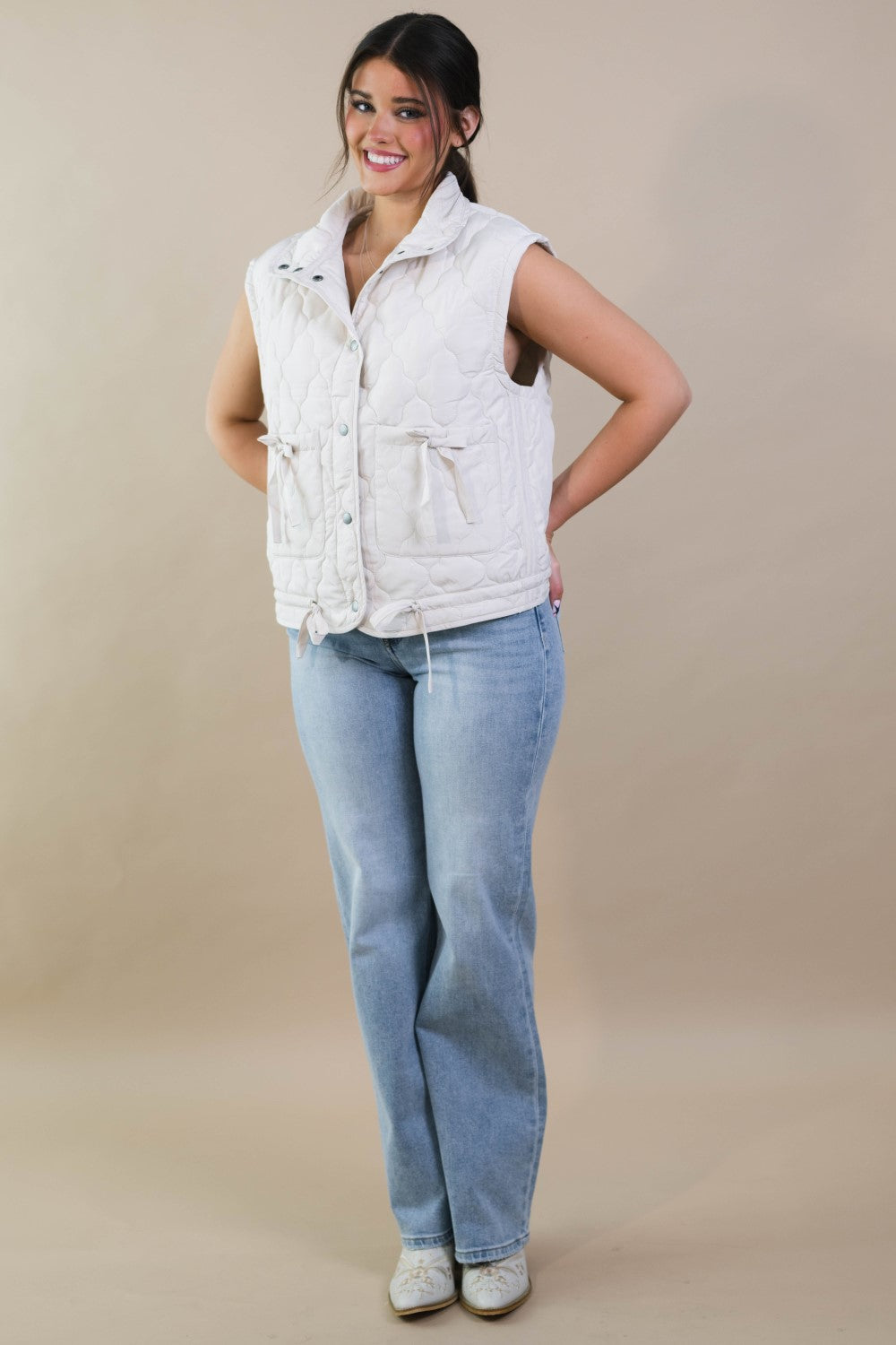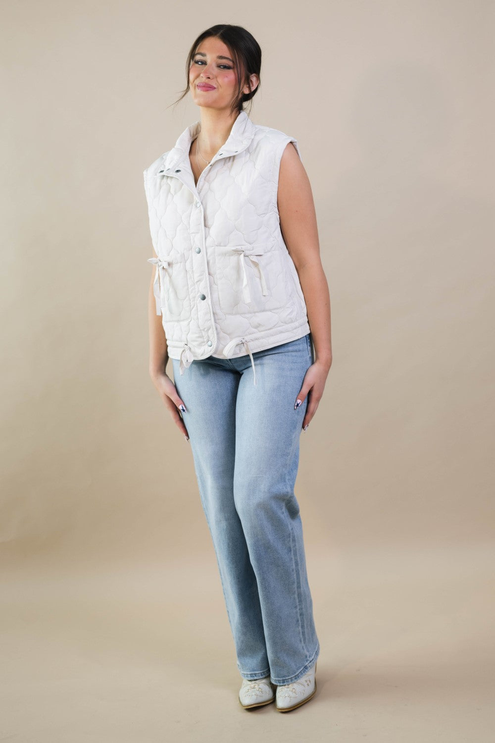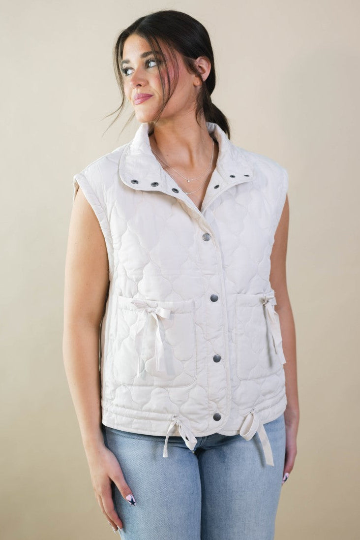 The Blake Quilted Puffer Vest – Cream is a versatile layering piece that blends soft structure with everyday functionality. Designed with a relaxed fit and a snap-button front closure, this vest features adjustable side ties that allow you to cinch the waist for a more defined shape or wear it loose for easy layering. It’s a polished yet casual option for cool-weather errands, casual workdays, or weekend plans.