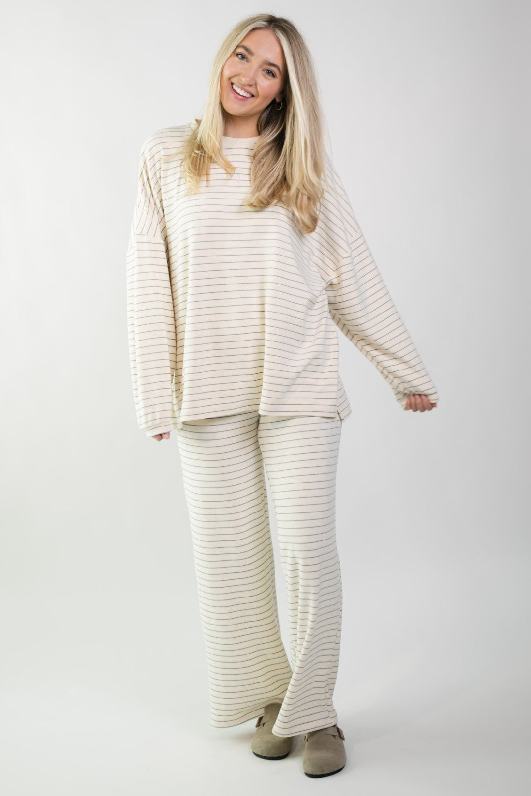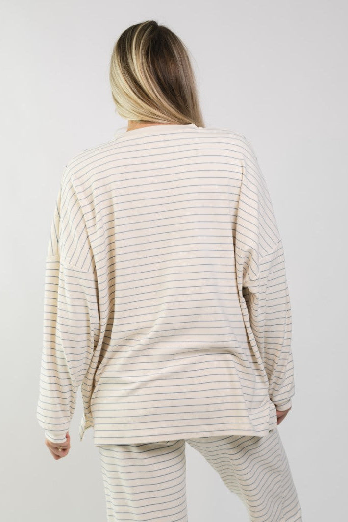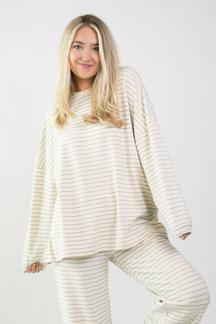 Ivory Fleece Oversized Top is the kind of cozy layer you’ll want on repeat for laid-back days and off-duty plans. Designed with a relaxed, oversized fit and subtle stripe pattern, this top feels effortless whether you’re lounging at home, traveling, or grabbing coffee. Wear it solo with denim or pair it with the matching Ivory Fleece Stripe Pants for an elevated lounge look.
