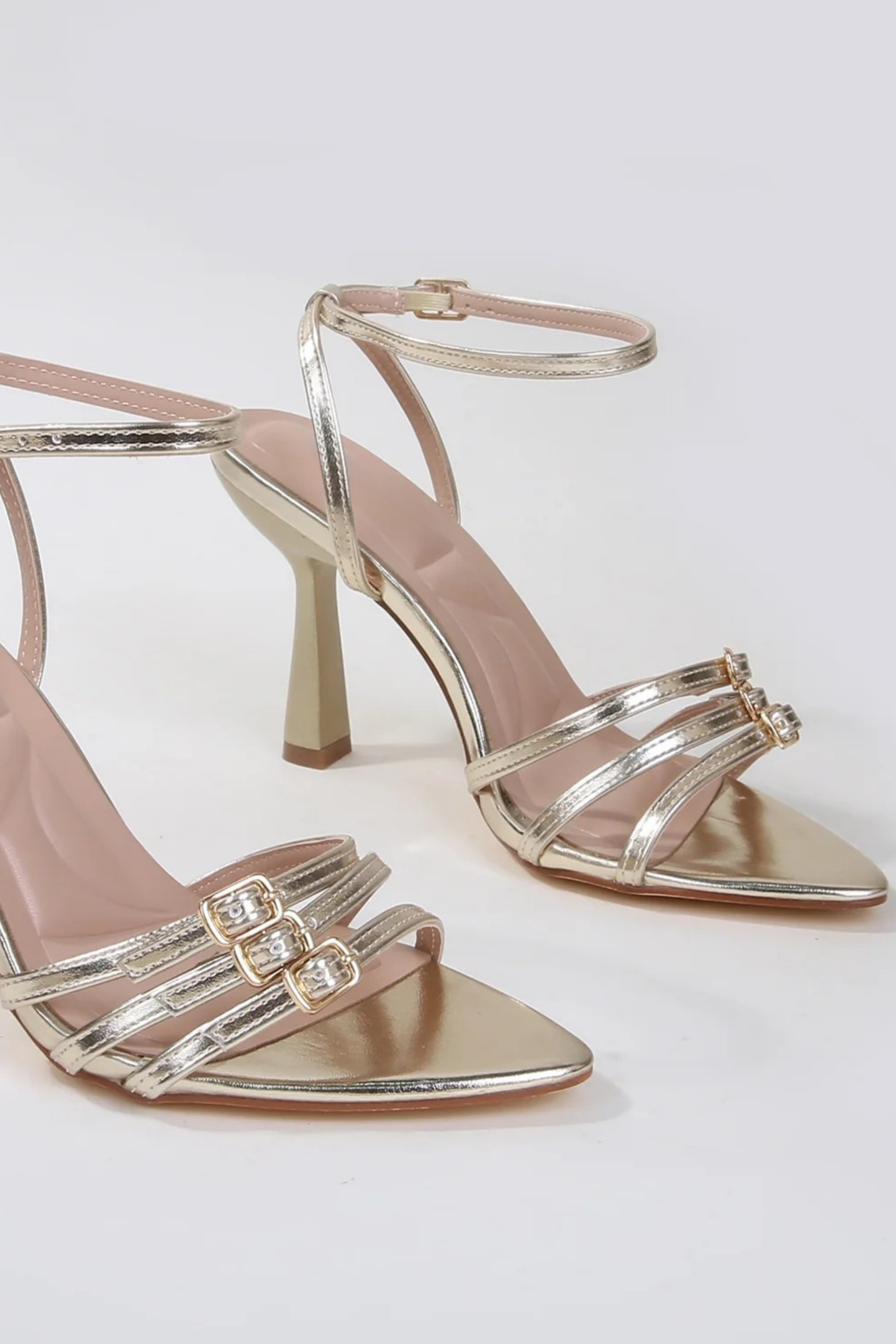 The Chic Strap Gold Heel is a sleek and modern evening sandal with a polished gold finish that elevates any holiday or formal outfit.