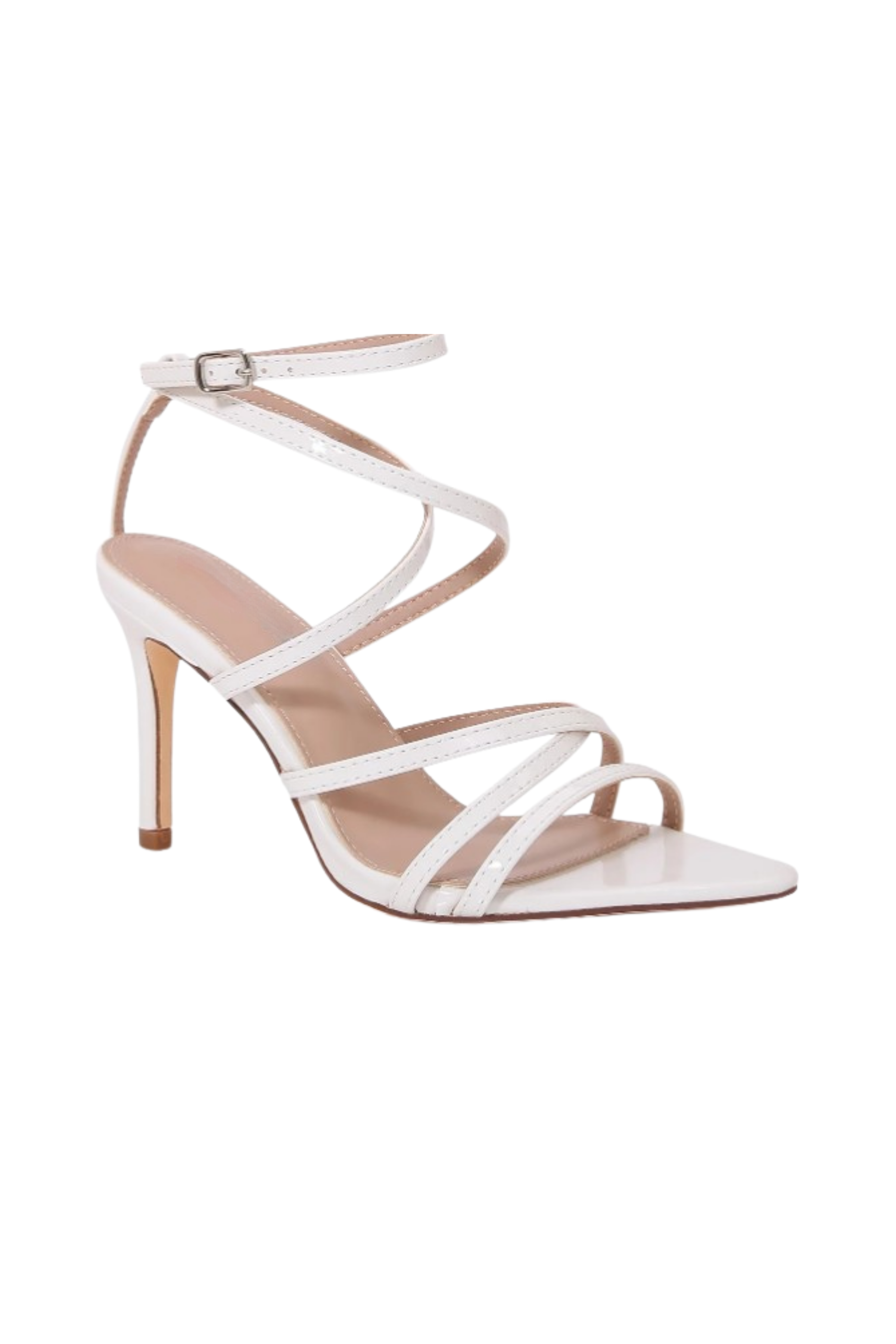 The Ciece White Strap Heel is a clean, minimalist sandal with a strappy silhouette that feels modern and versatile for winter events, holiday parties, and year-round dressing. Its wraparound ankle straps and sleek stiletto heel create a polished look that pairs easily with satin dresses, tailored jumpsuits, or even dressy denim.
