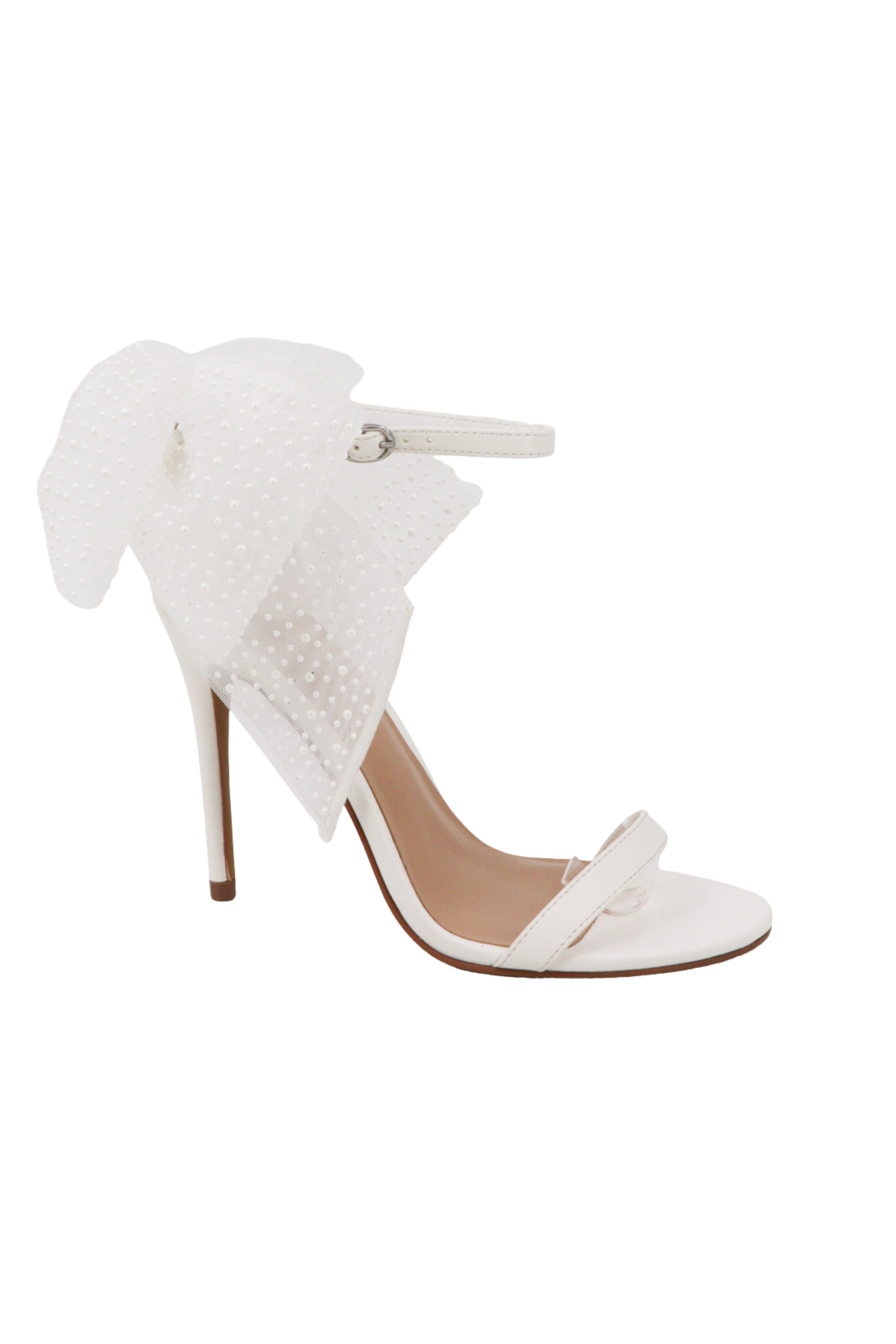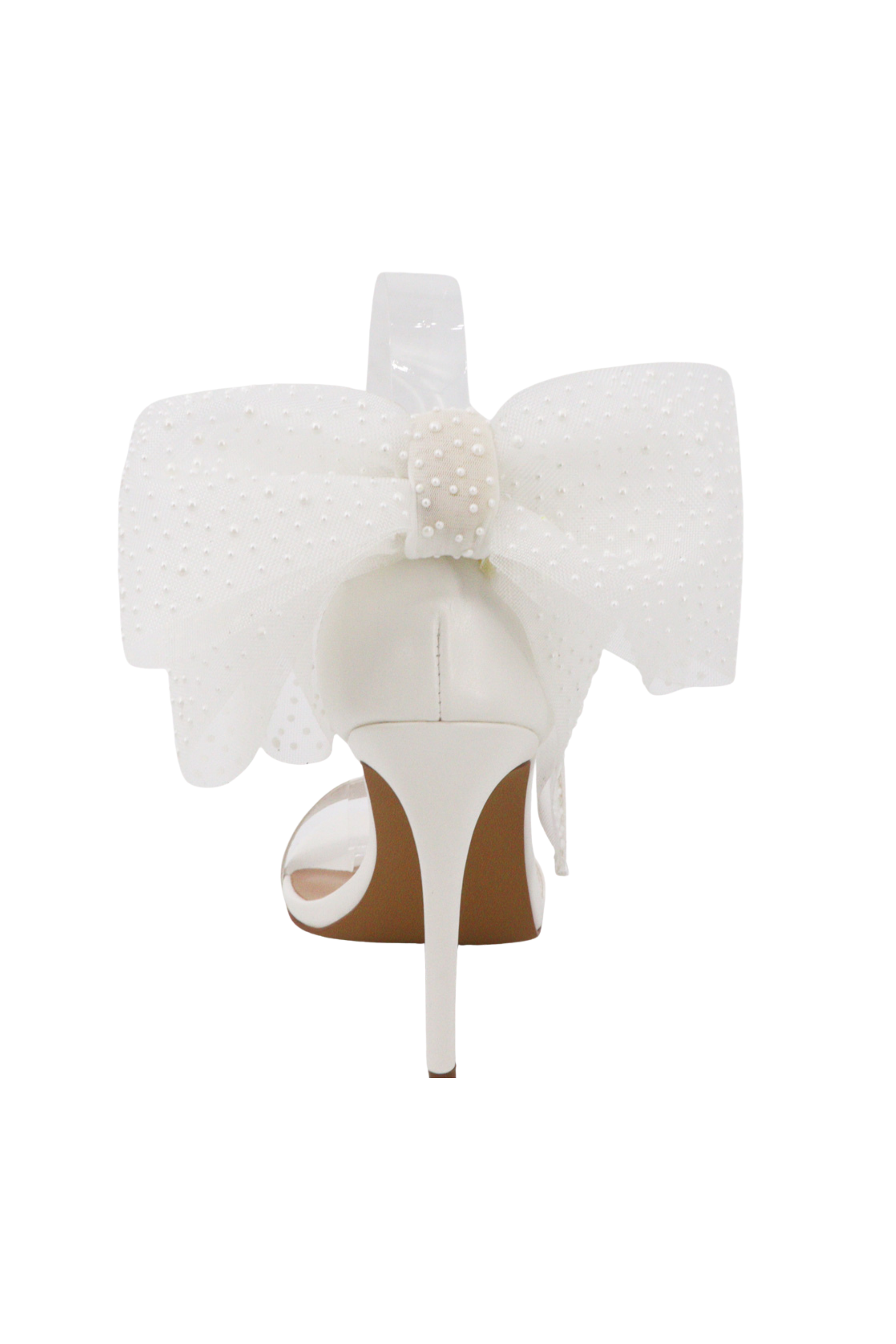 The Dashing Back Bow White Heel is a romantic statement shoe designed for bridal events, winter formals, and any moment that calls for something unforgettable. The oversized dotted mesh bow adds soft volume and texture, while the slim stiletto heel and minimalist front strap keep the silhouette elegant and modern.