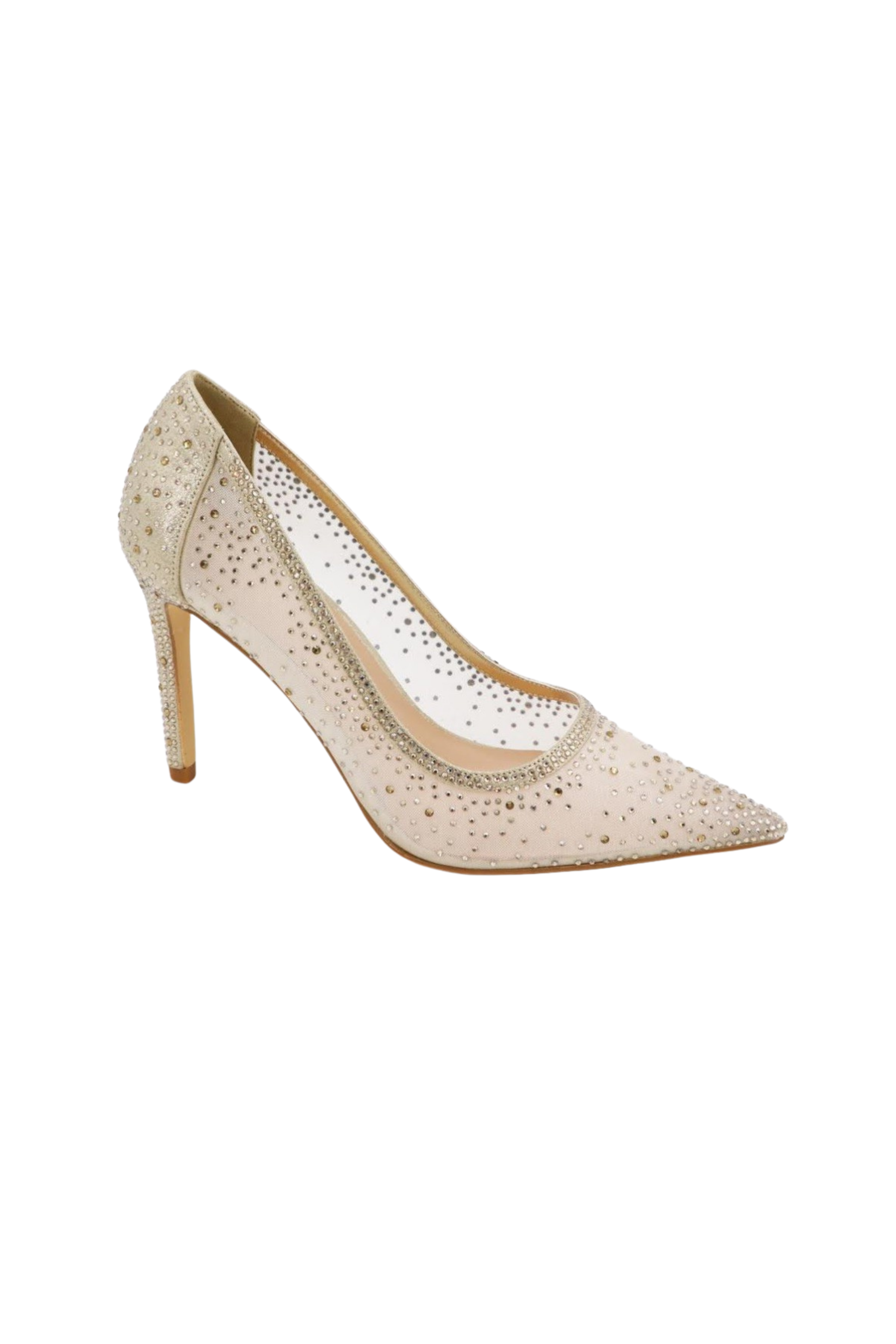 The Neroli Mesh Rhinestone Gold Heel is a sleek, sculpted pump designed for holiday parties, winter weddings, and dressy nights out. Its sheer mesh body and scattered rhinestone detailing create a light-catching sparkle while the gold stiletto heel adds a polished finish that pairs effortlessly with mini dresses, gowns, and tailored holiday looks.