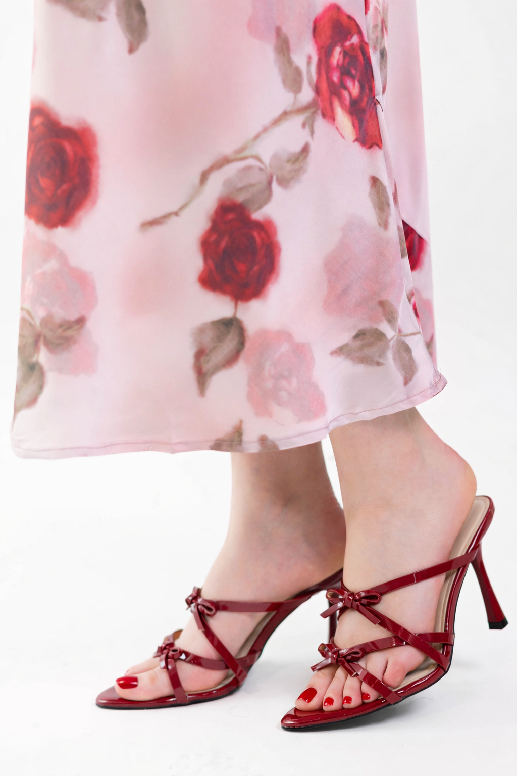 The Trace Bow Heel - Cherry is a glossy, fashion-forward mule that adds a playful twist to any dressy winter outfit. The cherry red patent finish and triple bow straps create a feminine statement, while the sleek stiletto heel keeps the silhouette polished for holiday parties, date nights, and festive evenings out.