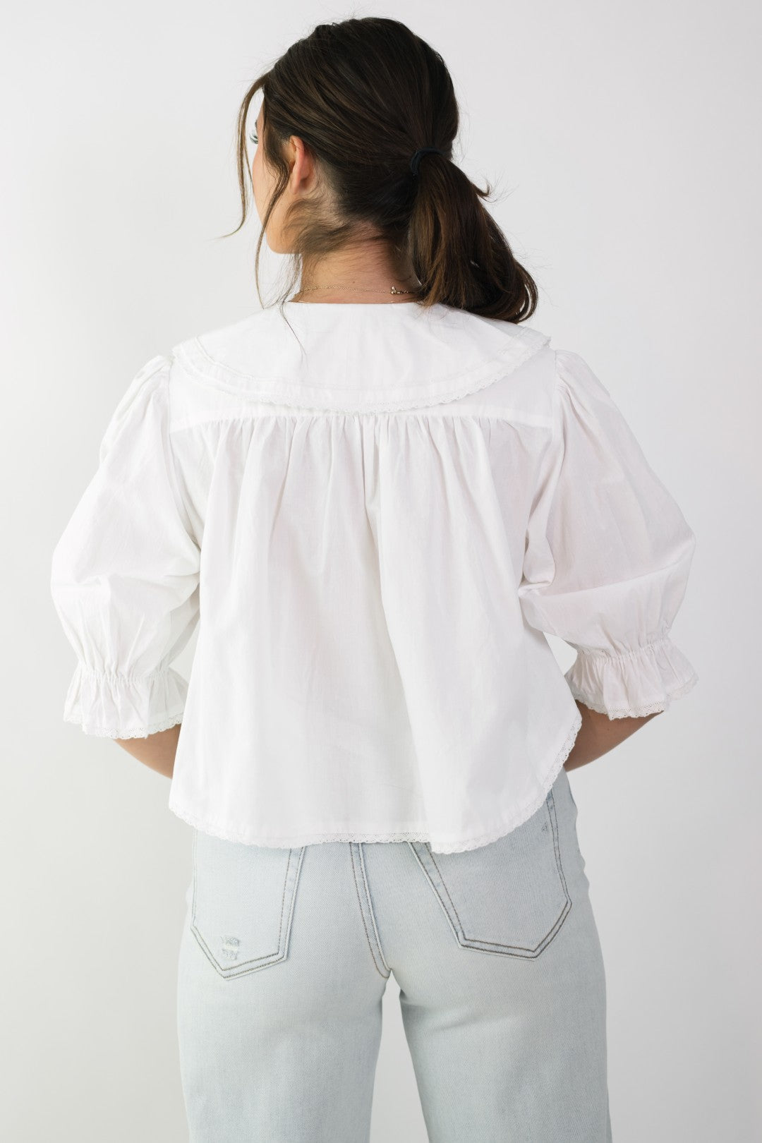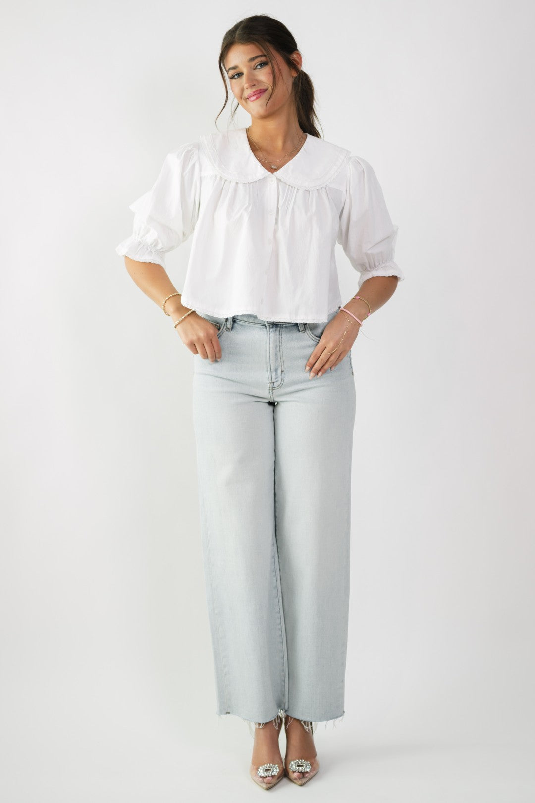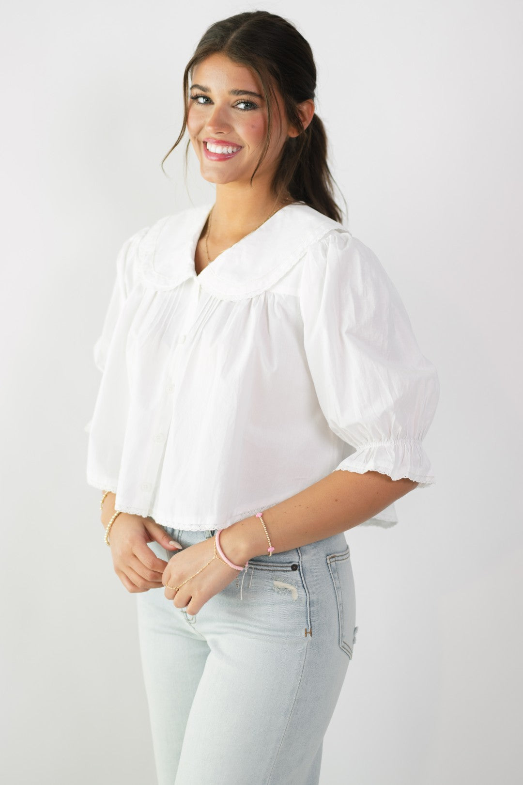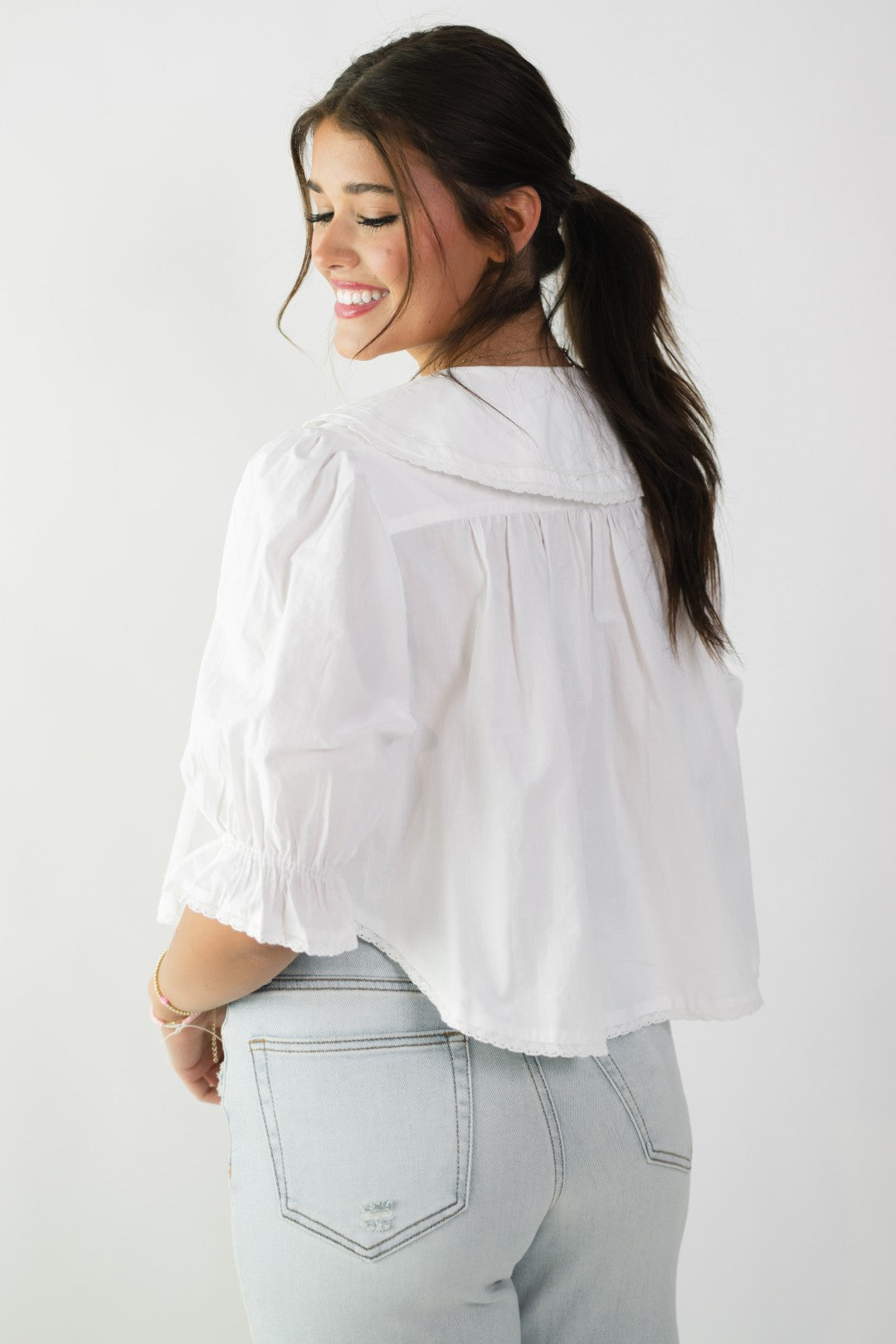 The Dolly Peter Pan Collar Top is a timeless staple with a soft, romantic twist. Designed with a crisp white finish, an oversized Peter Pan collar, and gently puffed sleeves, this top feels effortlessly polished while still being easy to wear. It’s the kind of piece that works for everything from spring gatherings to elevated everyday looks.