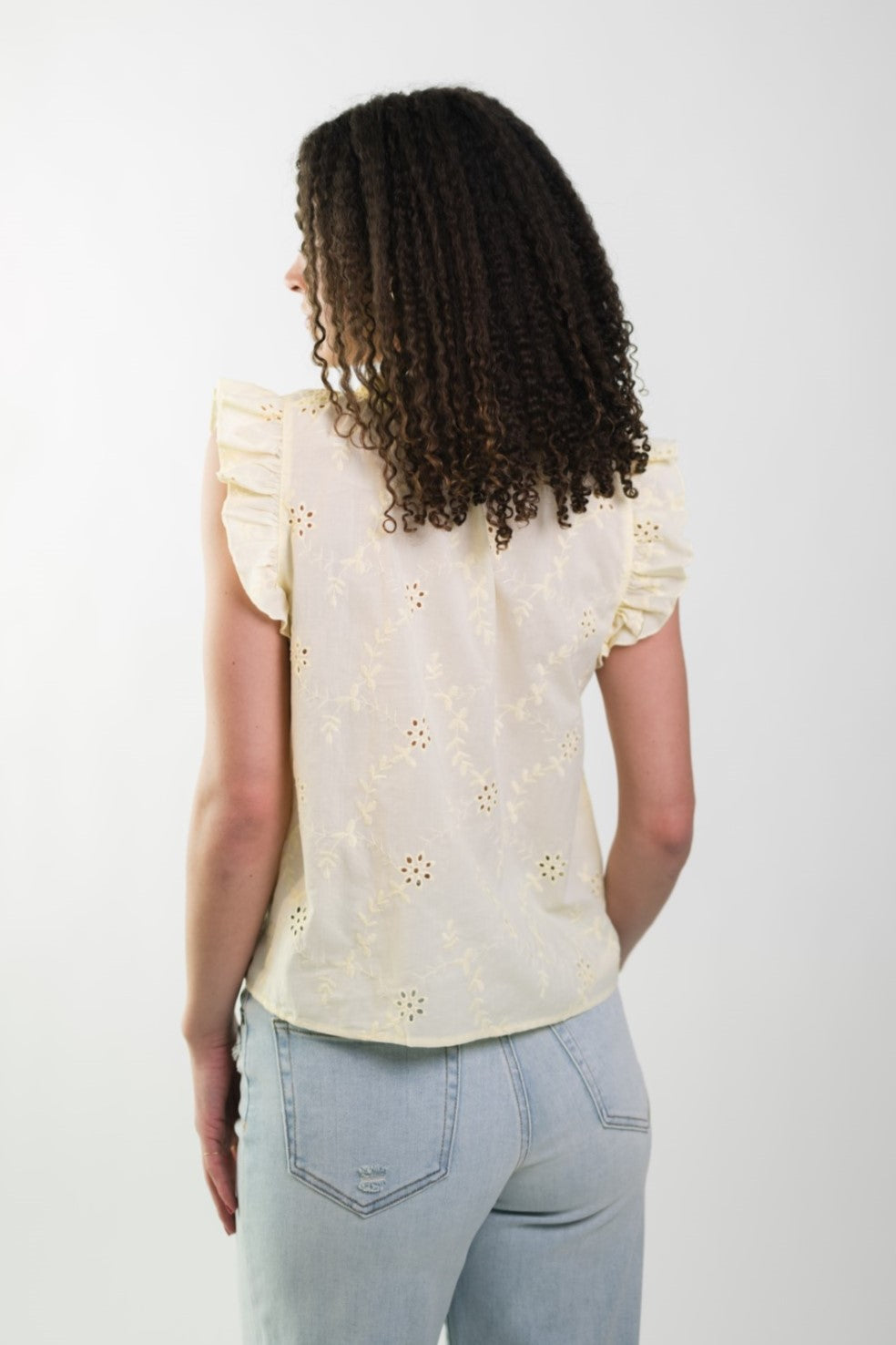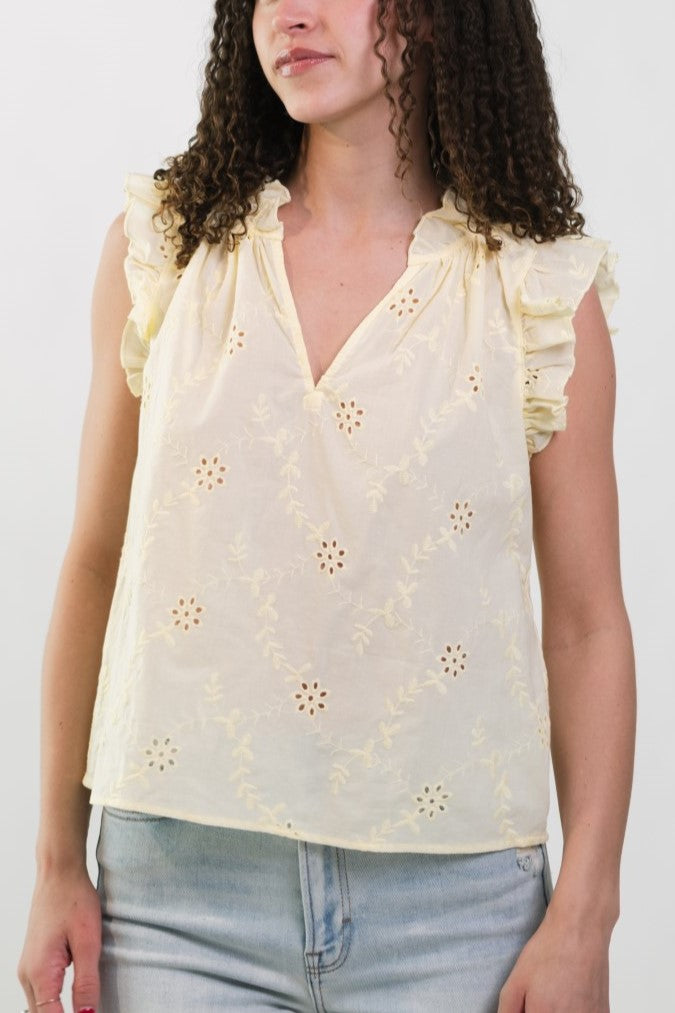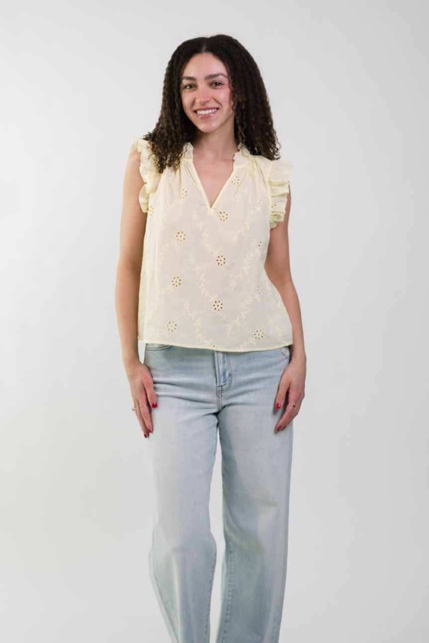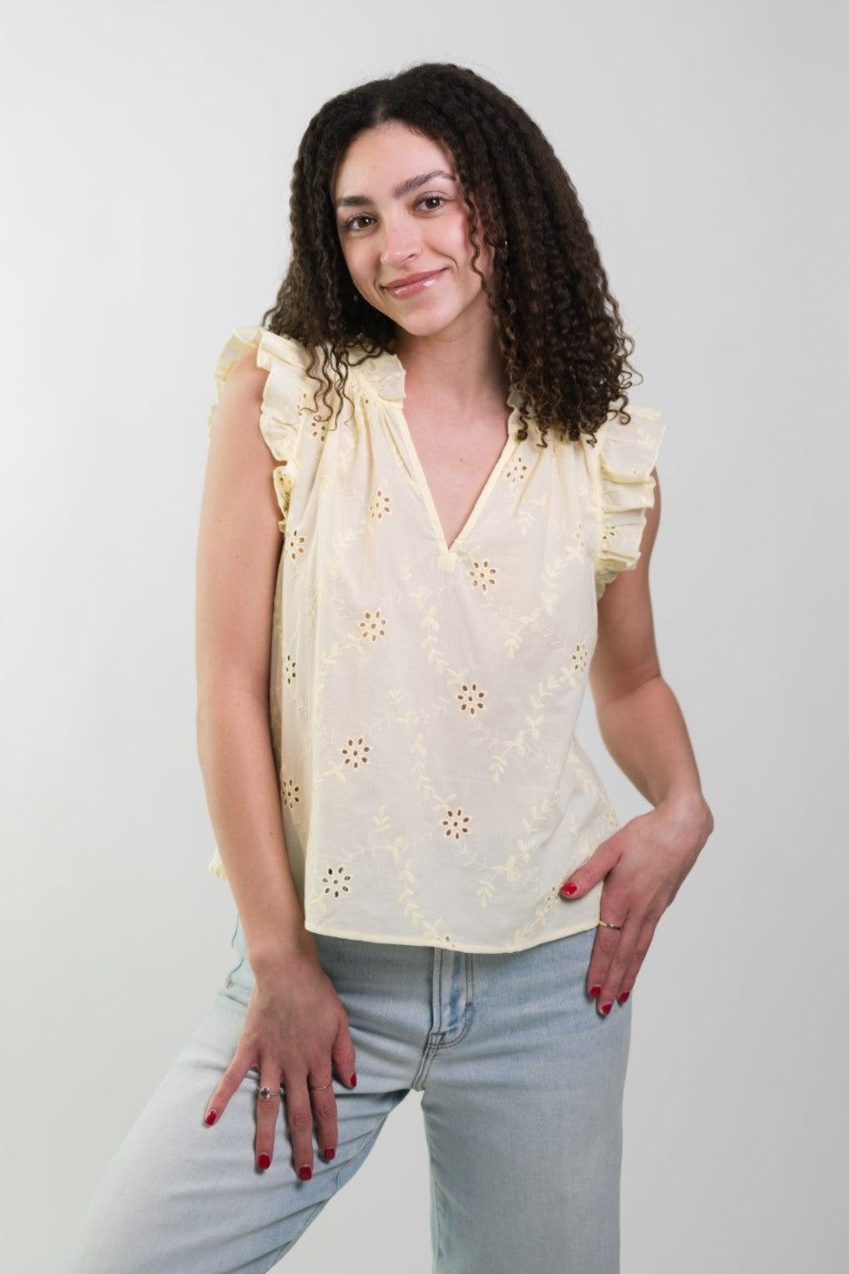 The Alora Butter Eyelet Top features a soft butter yellow hue that feels fresh and light, flutter-style sleeves and a flattering V-neckline. it creates an effortlessly graceful silhouette perfect for work OR play! Intricate embroidery and eyelet detailing add texture and charm, giving the top a beautifully elevated finish.
