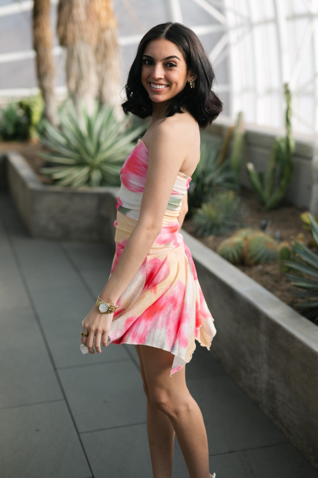 Watercolor-style print in soft pink and coral tones