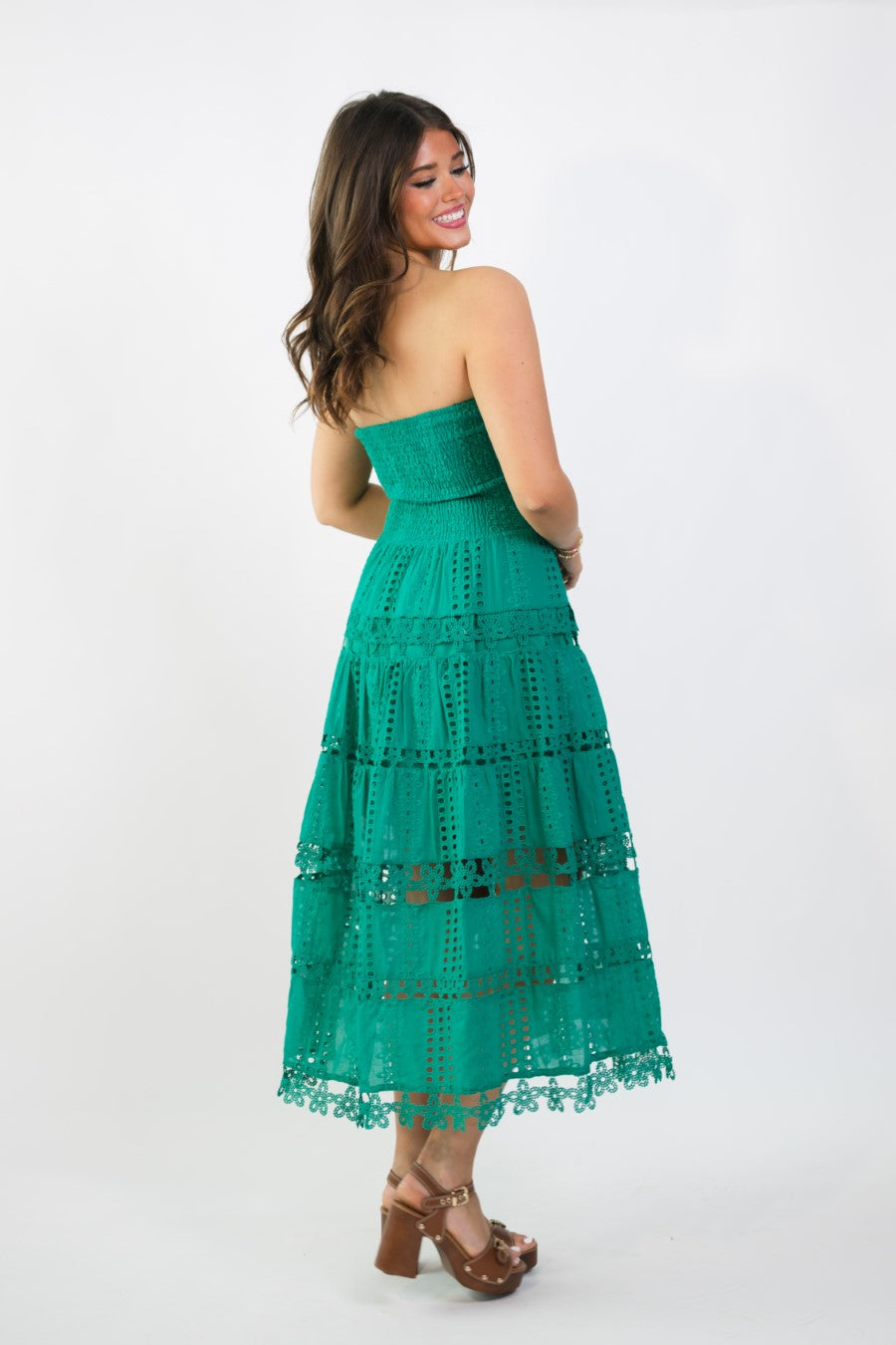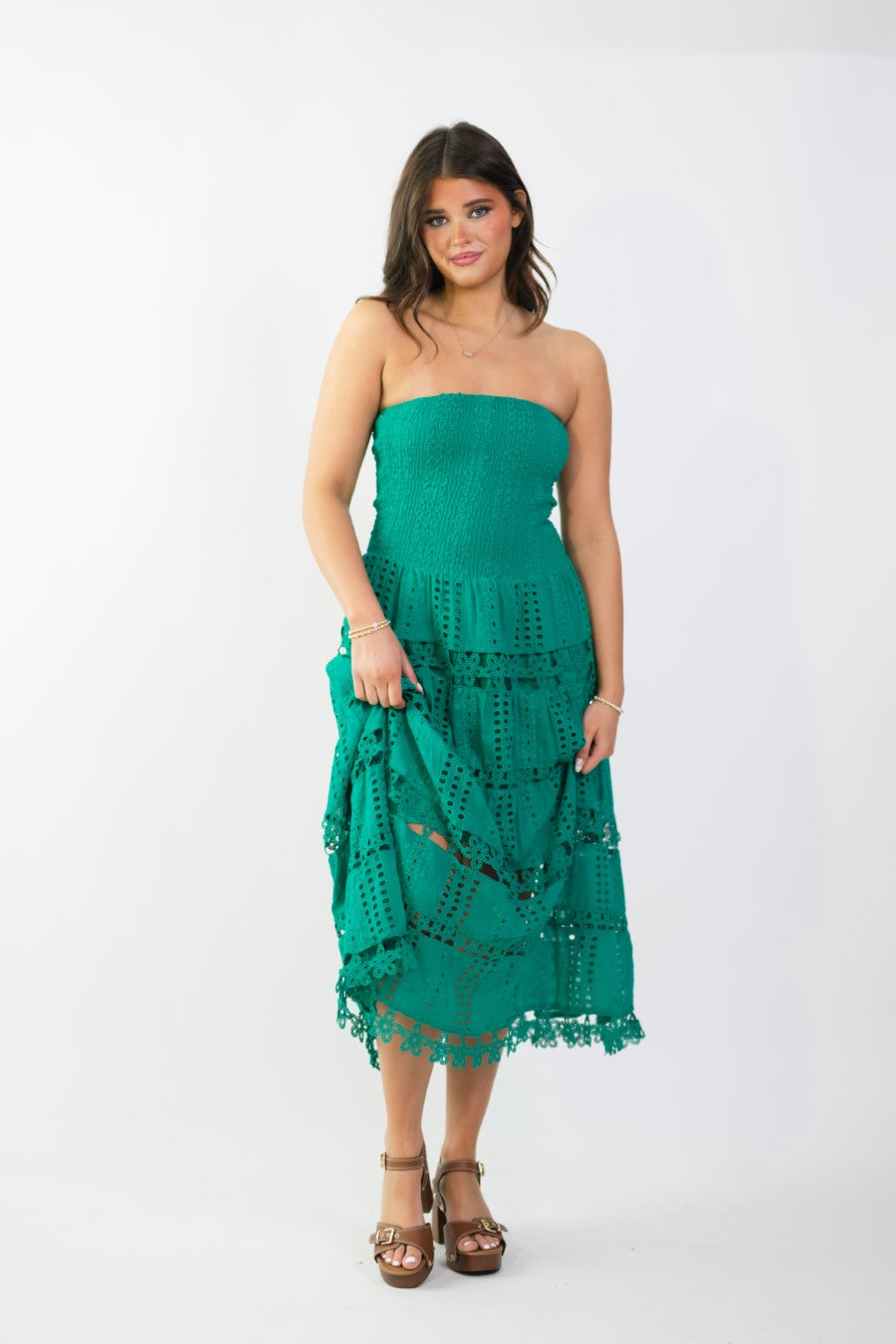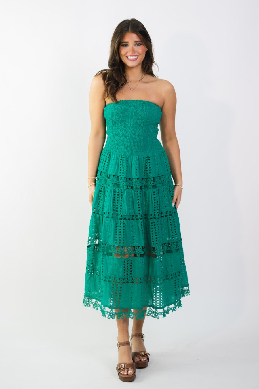 Emerald green eyelet lace midi dress