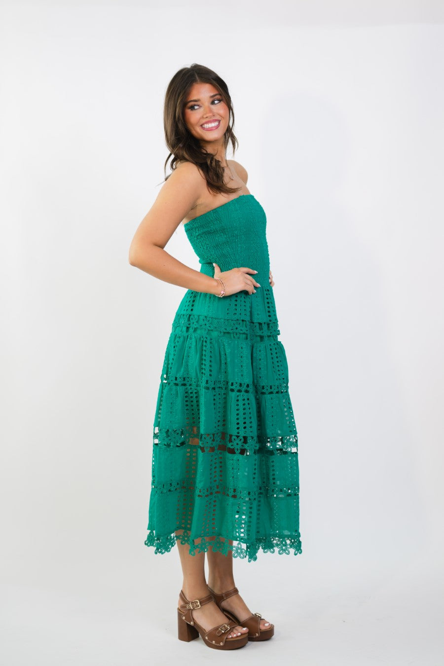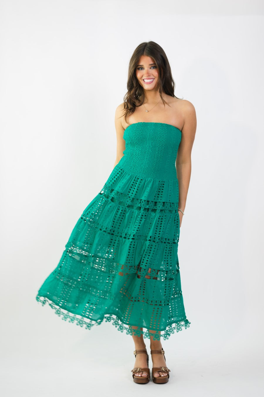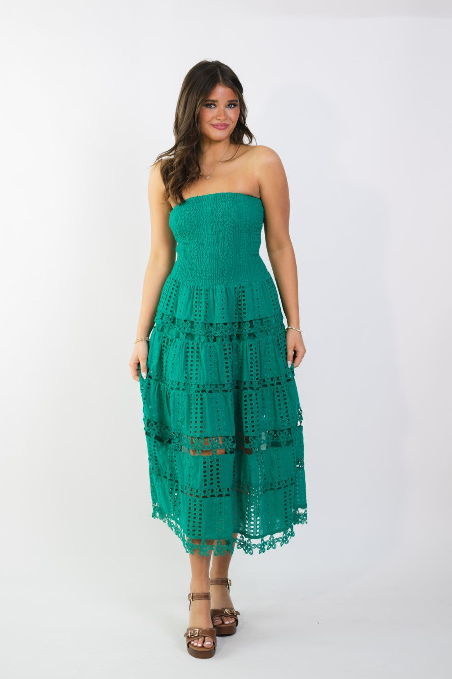 Emerald green eyelet lace midi dress