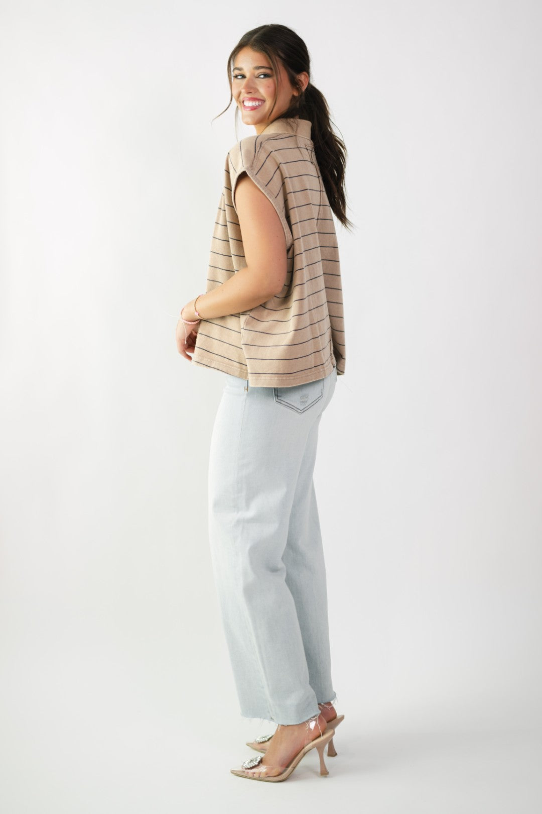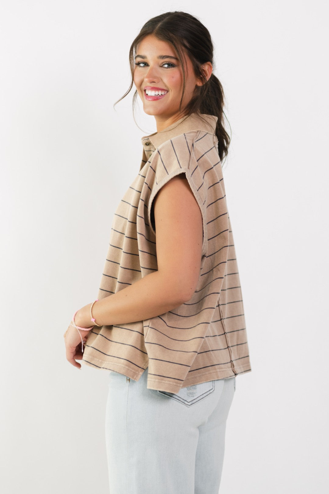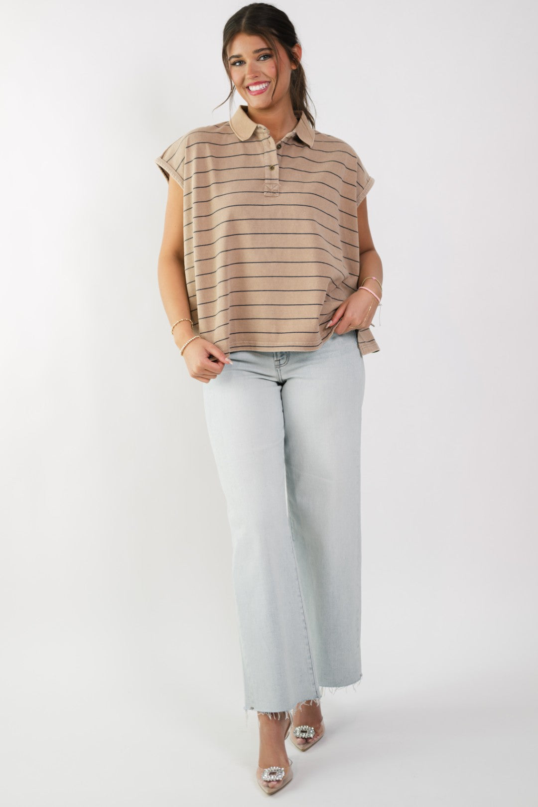 Easy, effortless, and quietly cool, the Boxy Stripe Polo Cap Sleeve Top is a fresh take on casual spring dressing. Designed with a relaxed boxy fit, subtle stripes, and a soft polo neckline, this top feels polished without trying too hard. It’s perfect for busy days when you want something comfortable but still styled, whether you’re heading to class, running errands, or meeting friends for lunch.