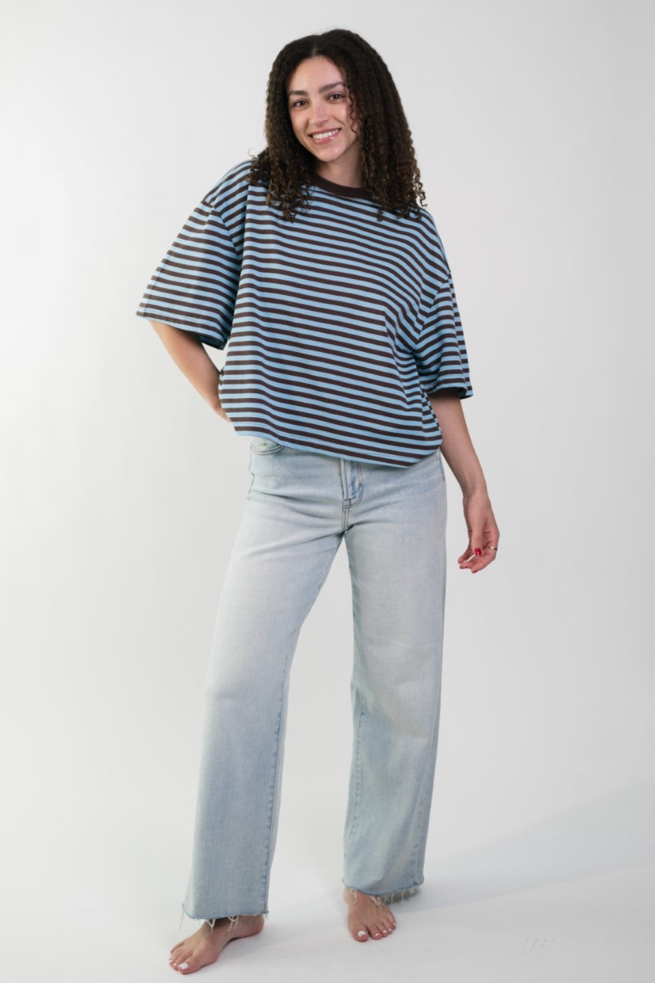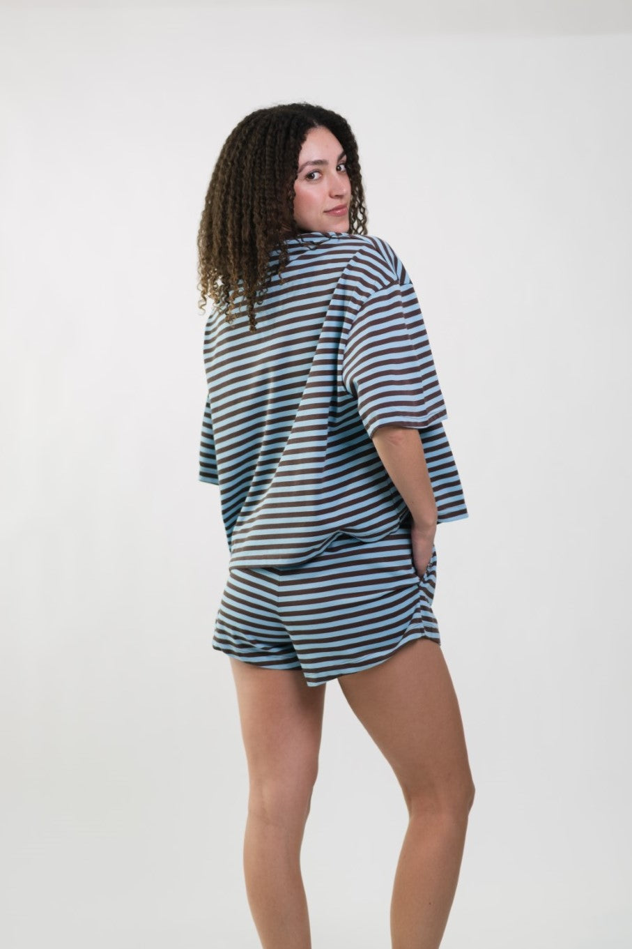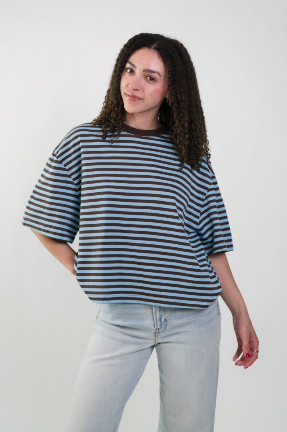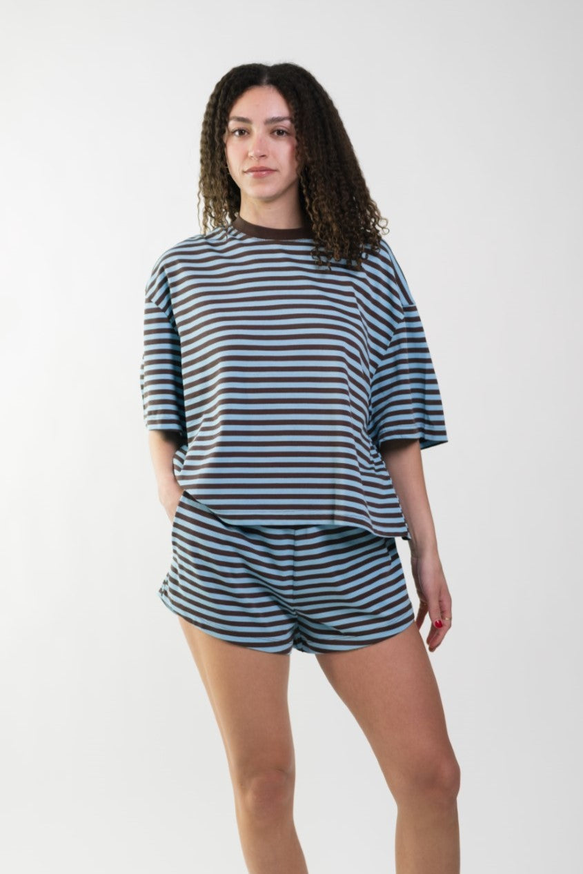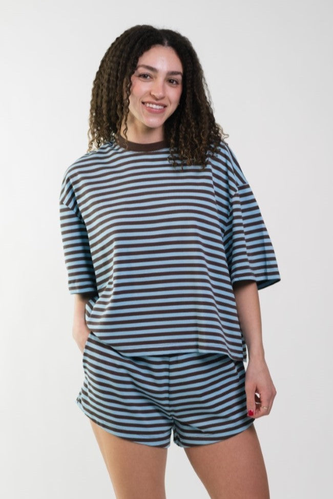 The Madi Brown/Blue Stripe Top is an effortlessly cool staple designed with a relaxed, boxy fit for all-day comfort. Crafted from an ultra-soft fabric, it drapes loosely for that perfectly undone, lived-in feel. Made for slow mornings, casual errands, and off-duty days, this top pairs perfectly with the Madi Brown/Blue Stripe Shorts for a coordinated set moment.