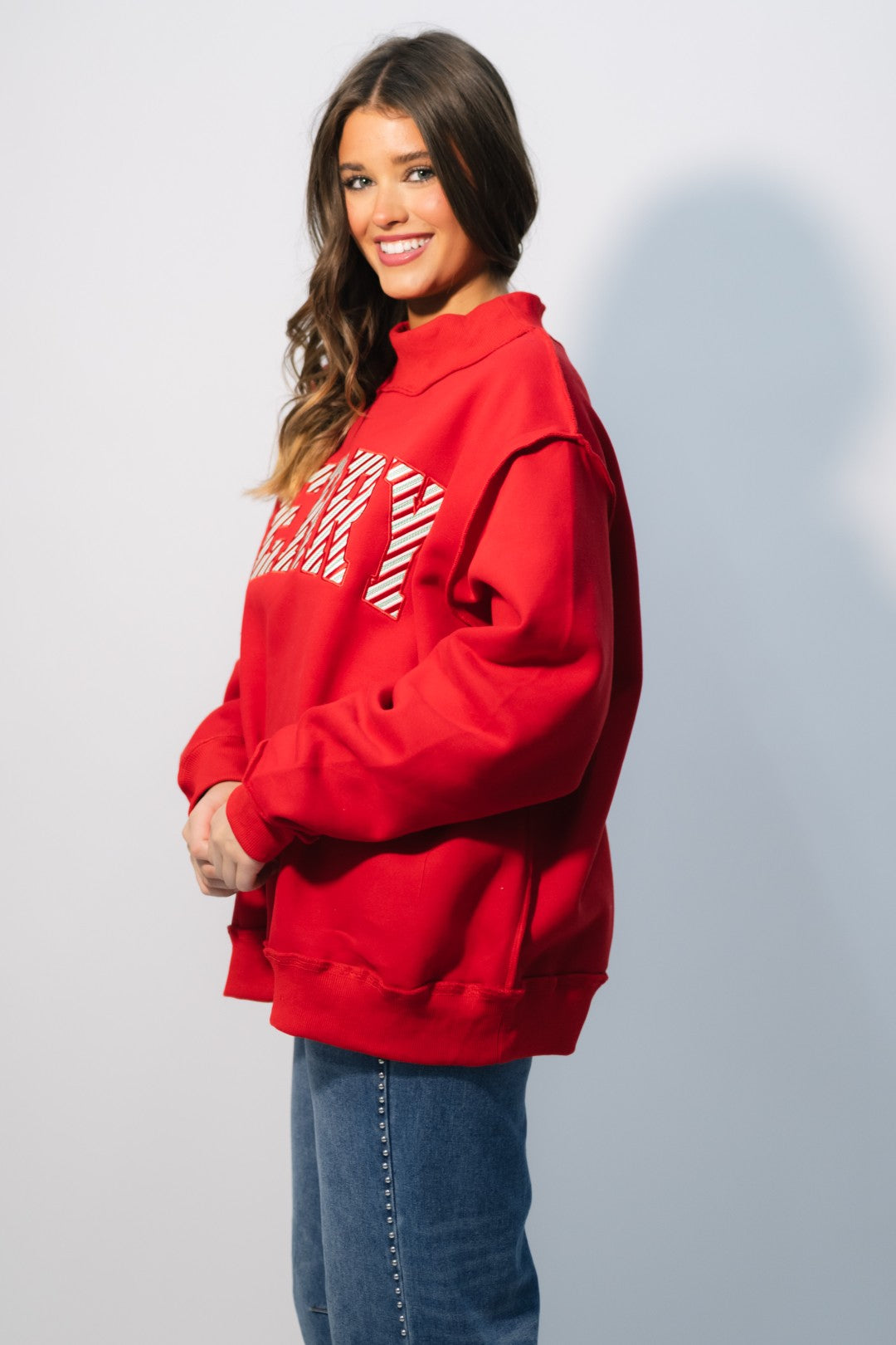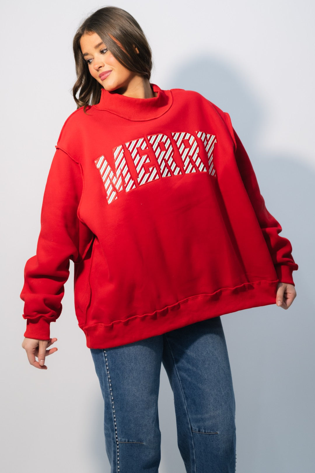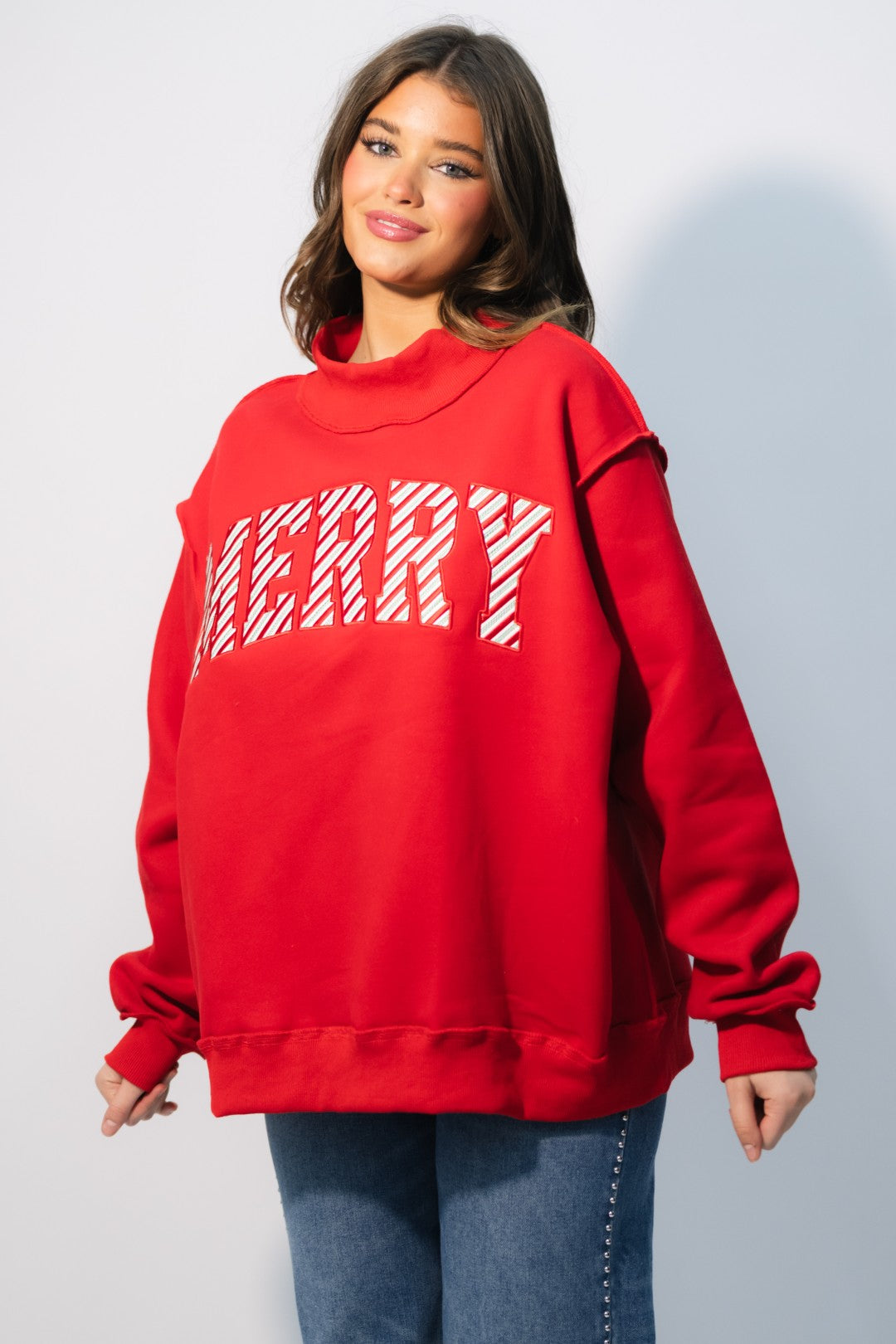 Bring on the cozy cheer with the ‘MERRY’ Embroidered Mock Neck Sweatshirt – Red. This festive favorite combines a bright, candy-cane-inspired design with ultra-soft fleece for that perfect holiday statement piece. The bold red hue and striped embroidery make it feel instantly seasonal while the oversized mock neck cut keeps it comfy and on-trend.