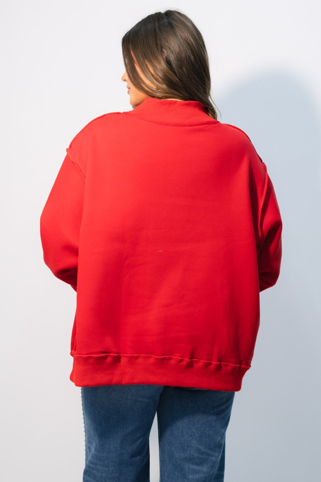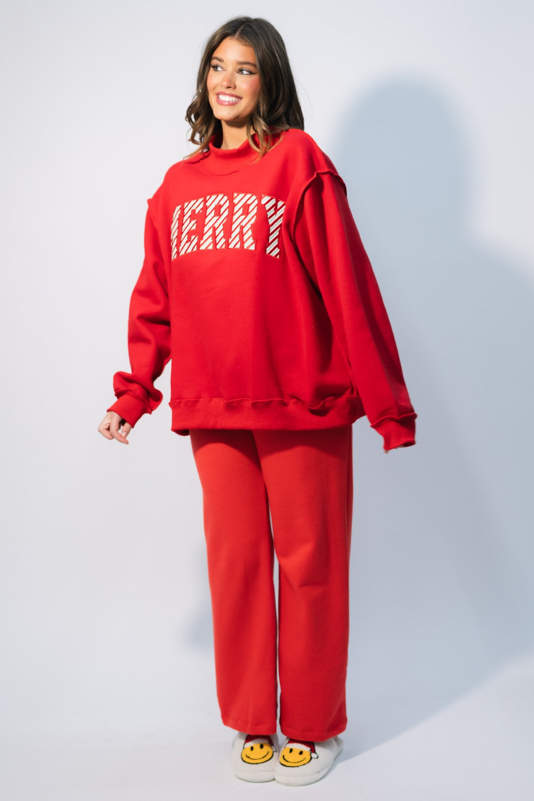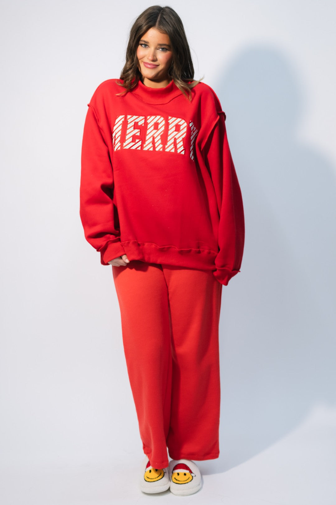 Bring on the cozy cheer with the ‘MERRY’ Embroidered Mock Neck Sweatshirt – Red. This festive favorite combines a bright, candy-cane-inspired design with ultra-soft fleece for that perfect holiday statement piece. The bold red hue and striped embroidery make it feel instantly seasonal while the oversized mock neck cut keeps it comfy and on-trend.