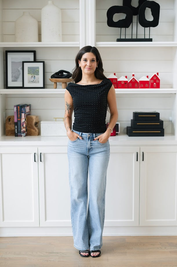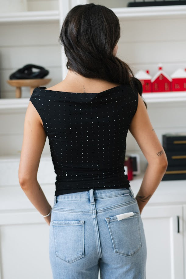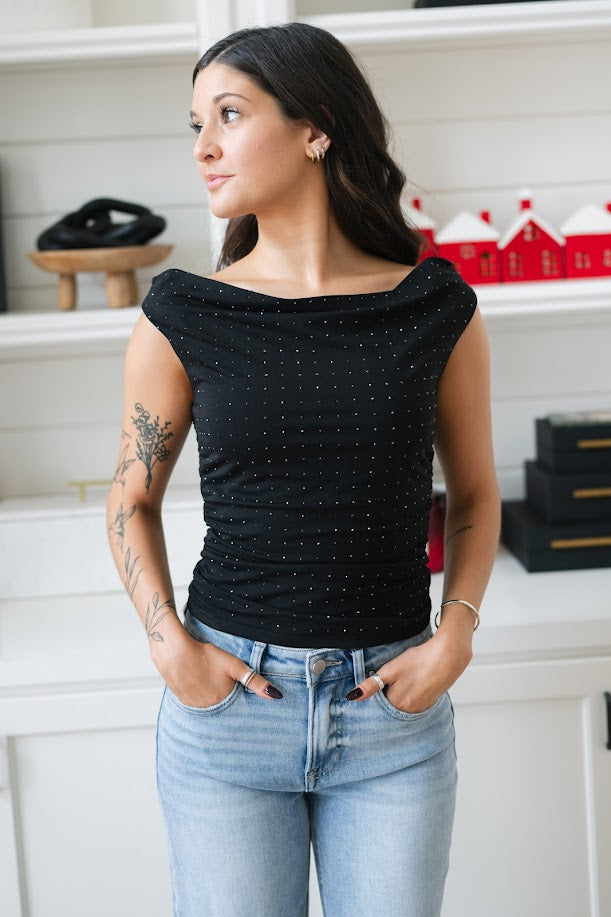 Black fitted top with scattered rhinestone embellishment