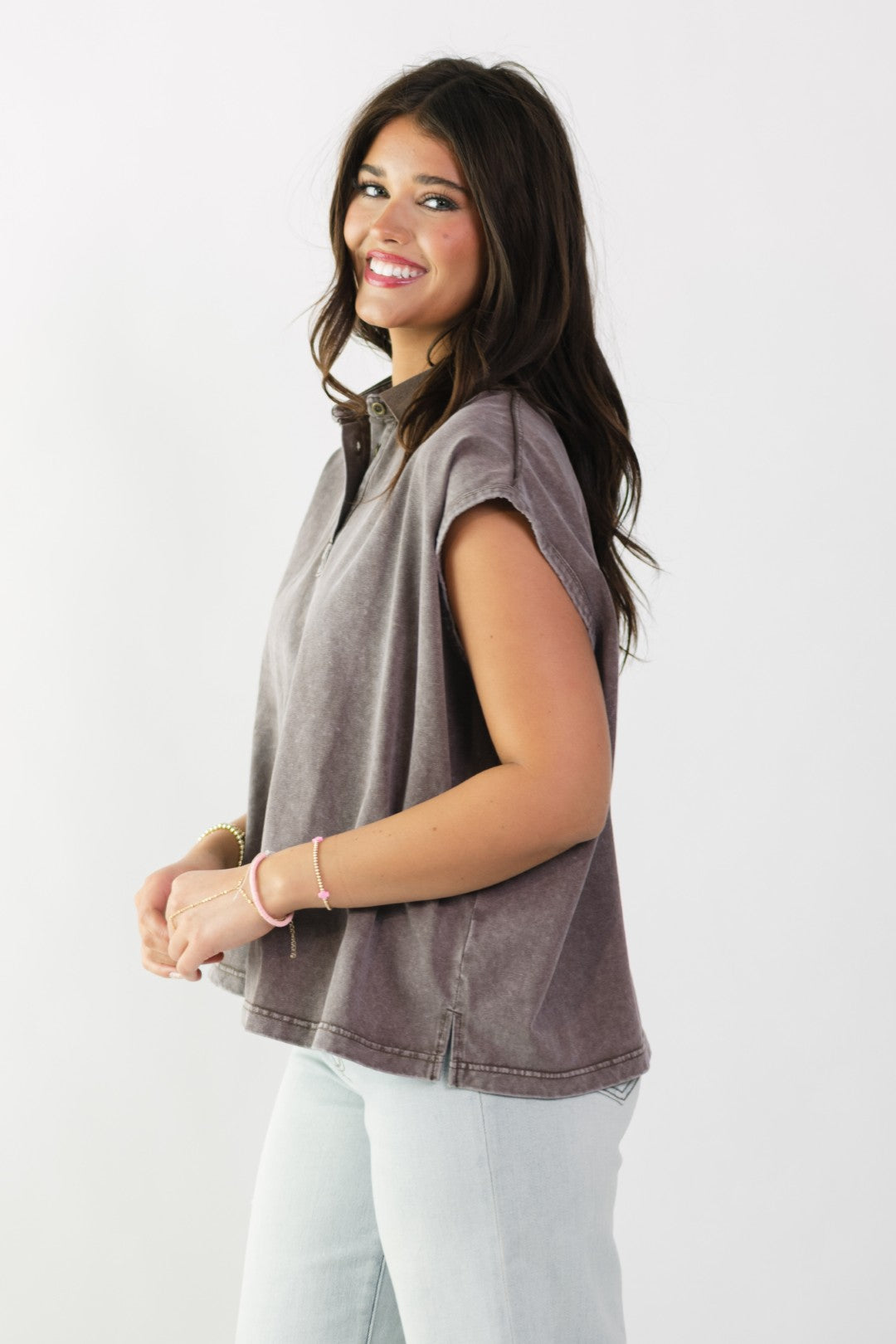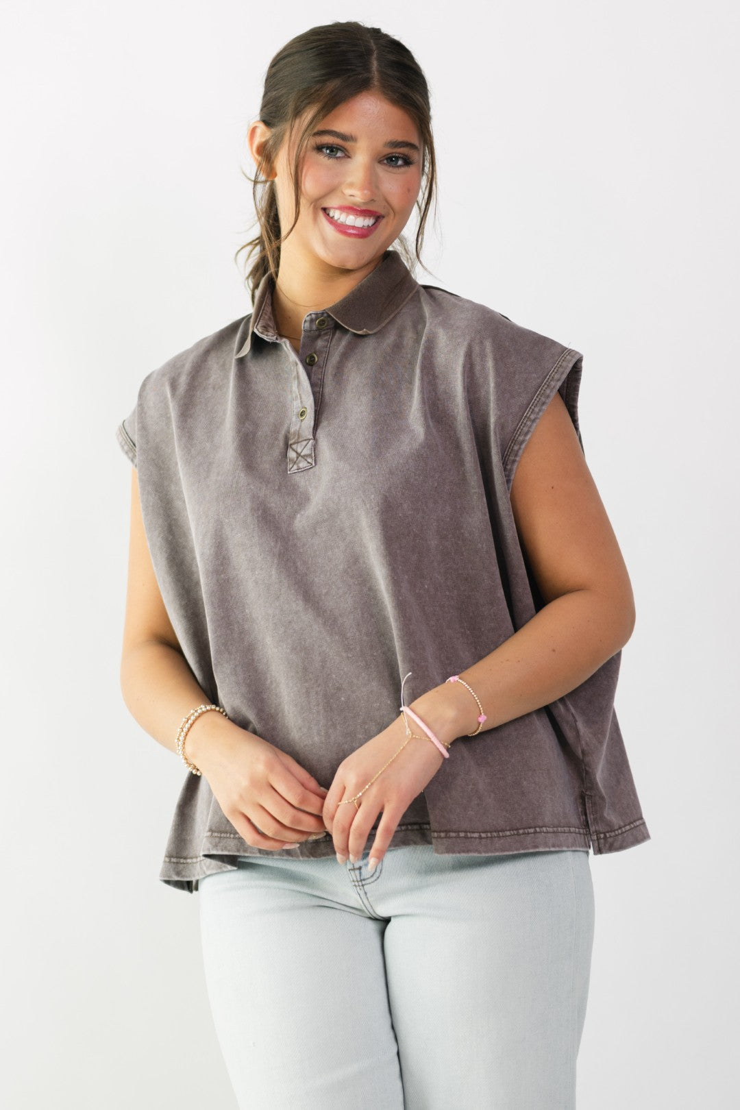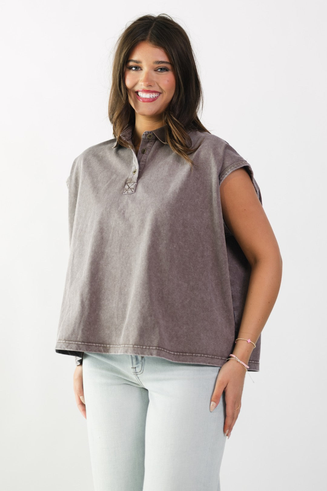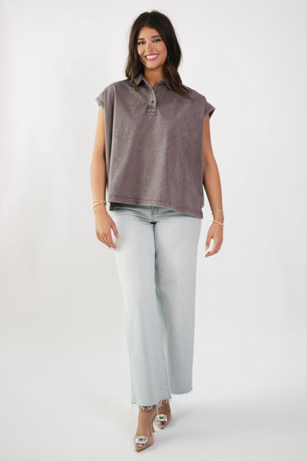 Laid-back with a cool, worn-in feel, the Solid Washed Polo Shirt Top is the kind of piece you’ll keep reaching for. Designed with a relaxed boxy silhouette, cap sleeves, and a soft polo neckline, this top feels effortlessly styled while staying comfortable. The washed finish gives it that lived-in look that works perfectly for casual days, travel outfits, or easy everyday layering.