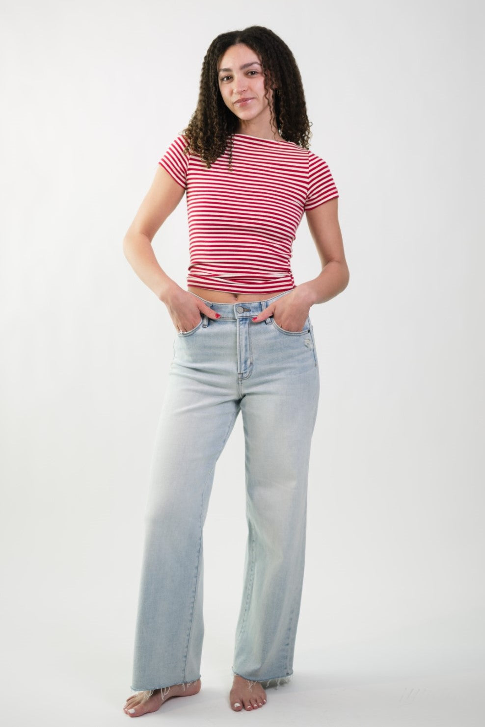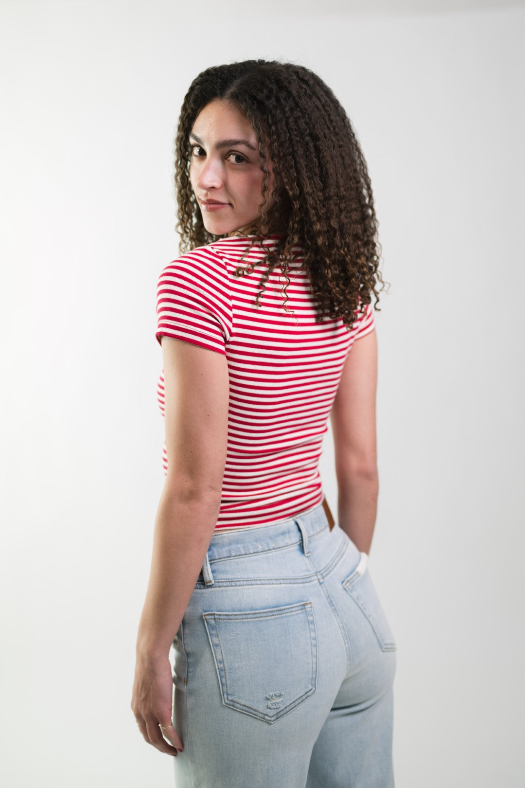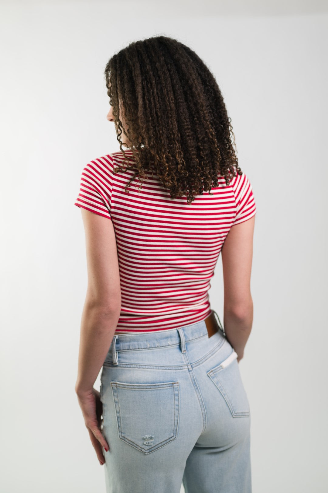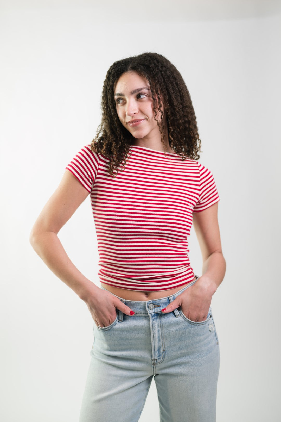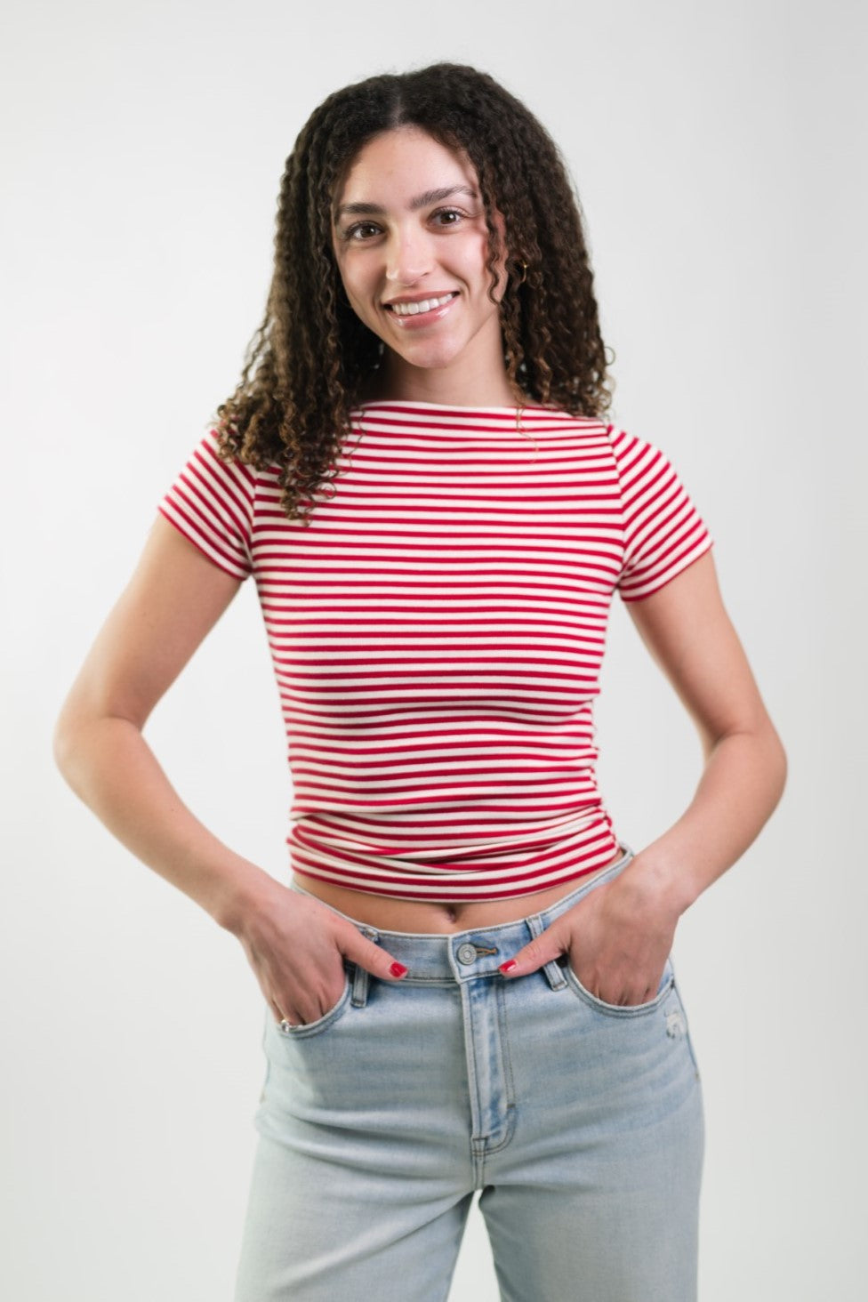 The Stripe Boat Neck Top features a classic red and ivory stripe pattern with a flattering boat neckline and fitted silhouette. Designed in a soft, stretch knit, it offers a comfortable, close-to-body fit that layers easily under jackets or pairs effortlessly with denim. A versatile everyday basic that works for casual weekends, game days, and transitional spring styling.