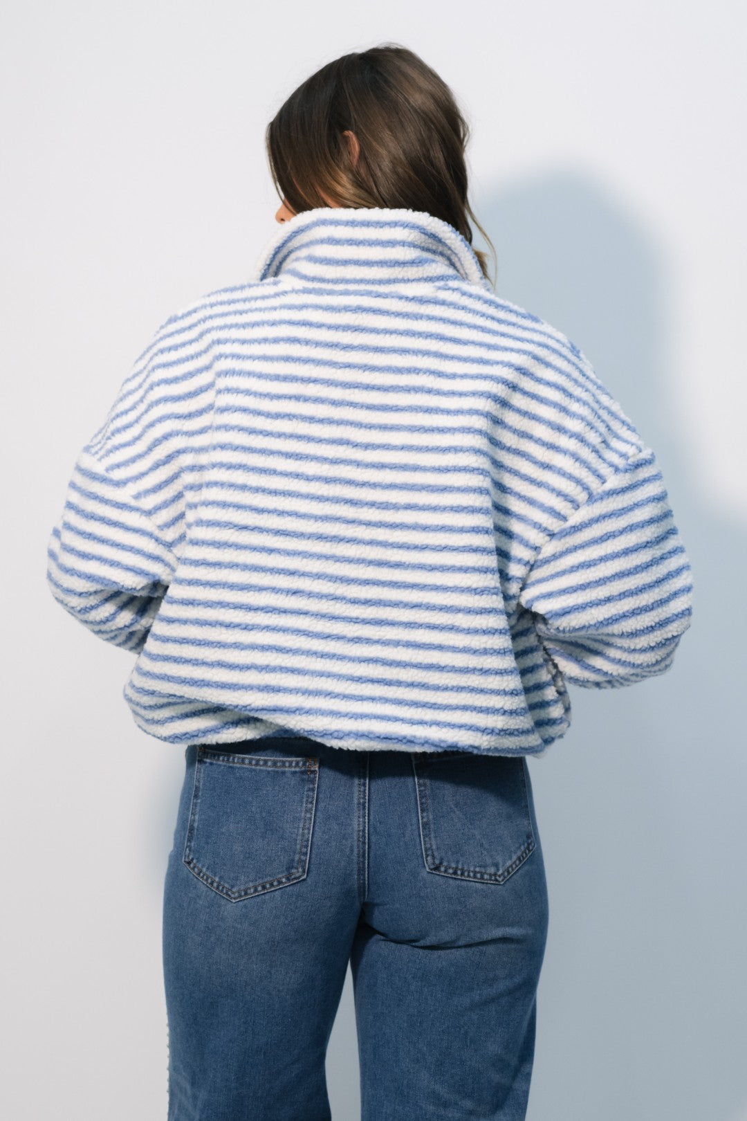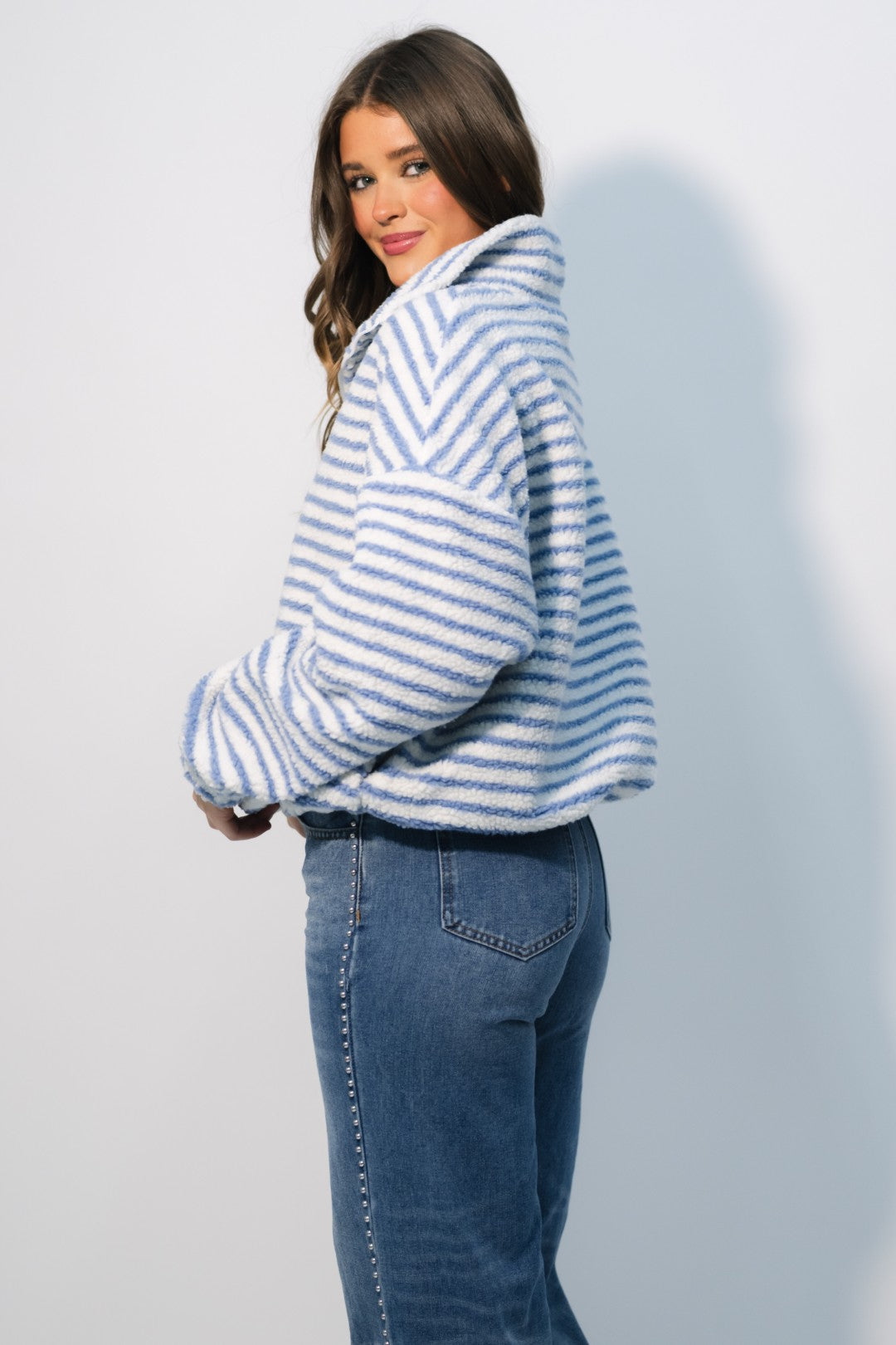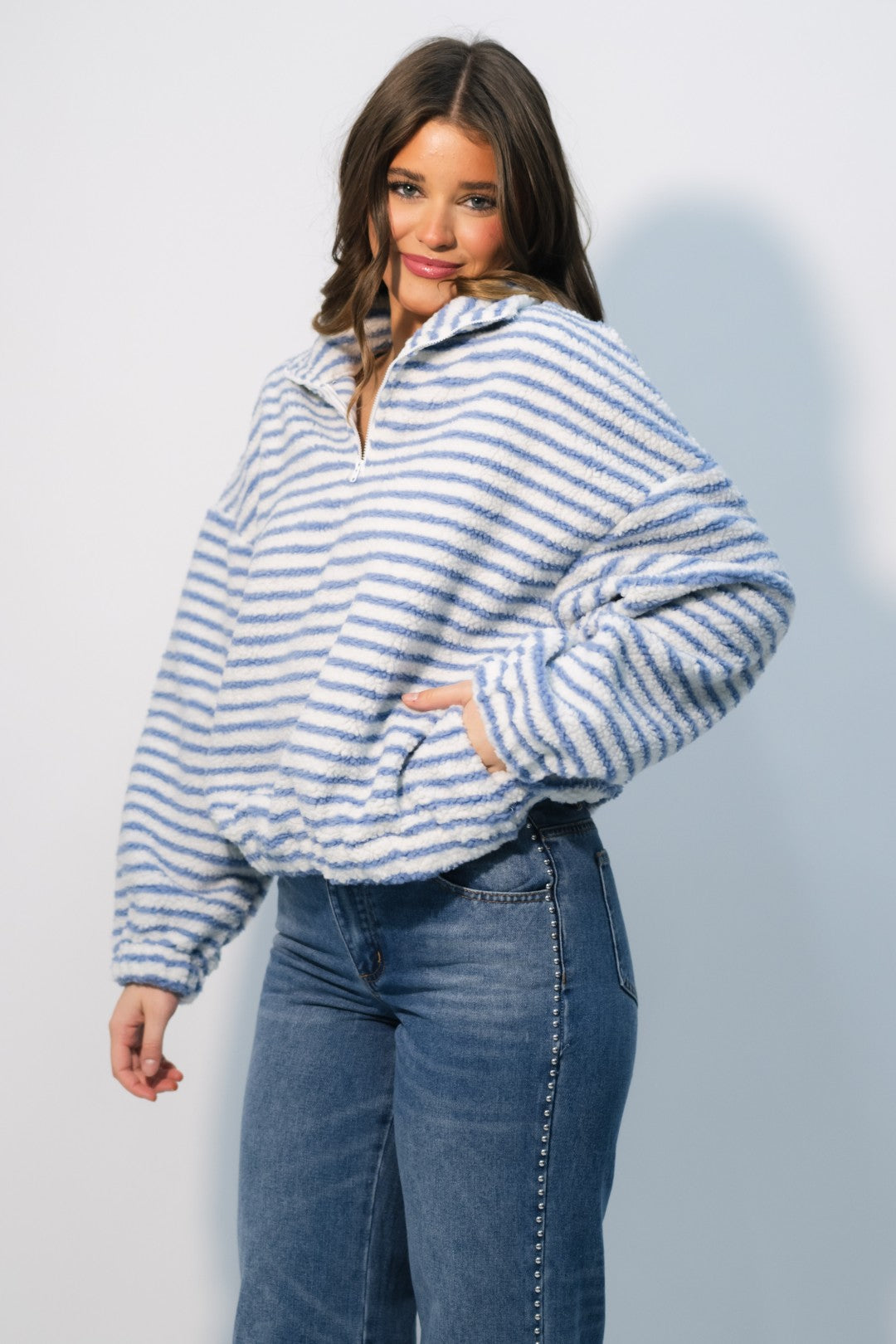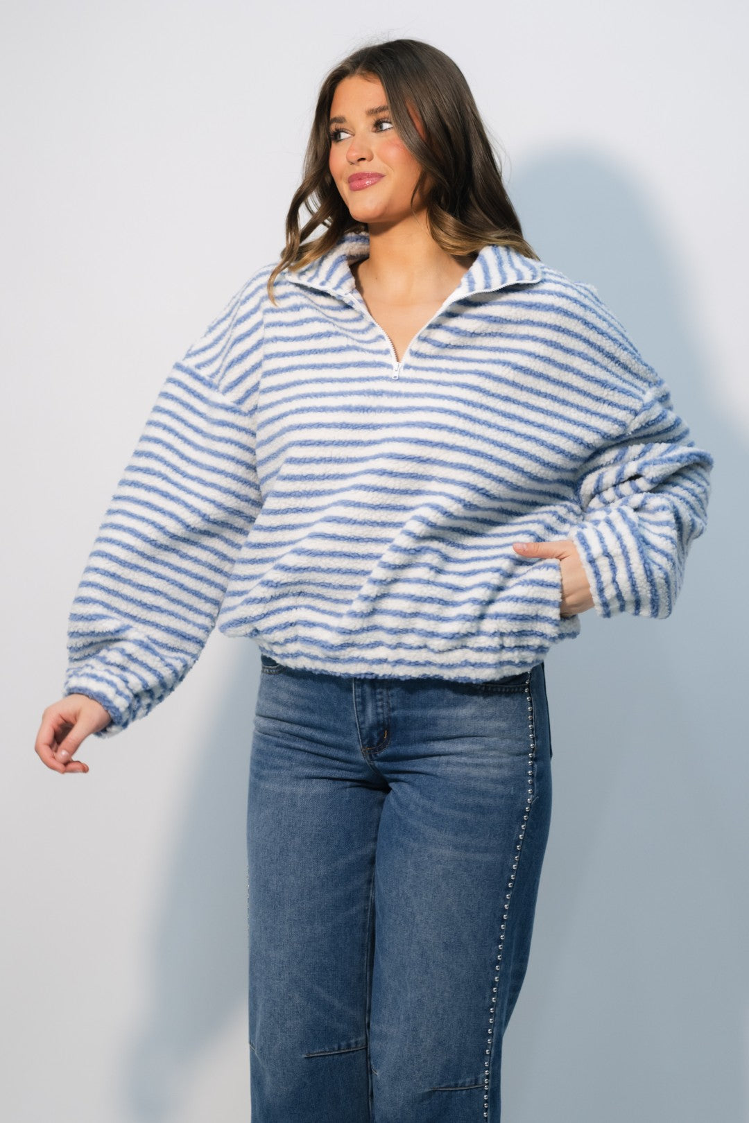 The Striped Half Zip Pullover is all about cozy vibes and playful stripes! This soft, fuzzy pullover is designed to keep you warm while adding a pop of fun to your fall wardrobe. With its half-zip design, it’s easy to throw on for a casual look that’s cute and comfortable. Perfect for lounging at home or running errands in style, this pullover will be your new go-to for chilly days. Snuggle up in style with the Striped Half Zip Pullover!