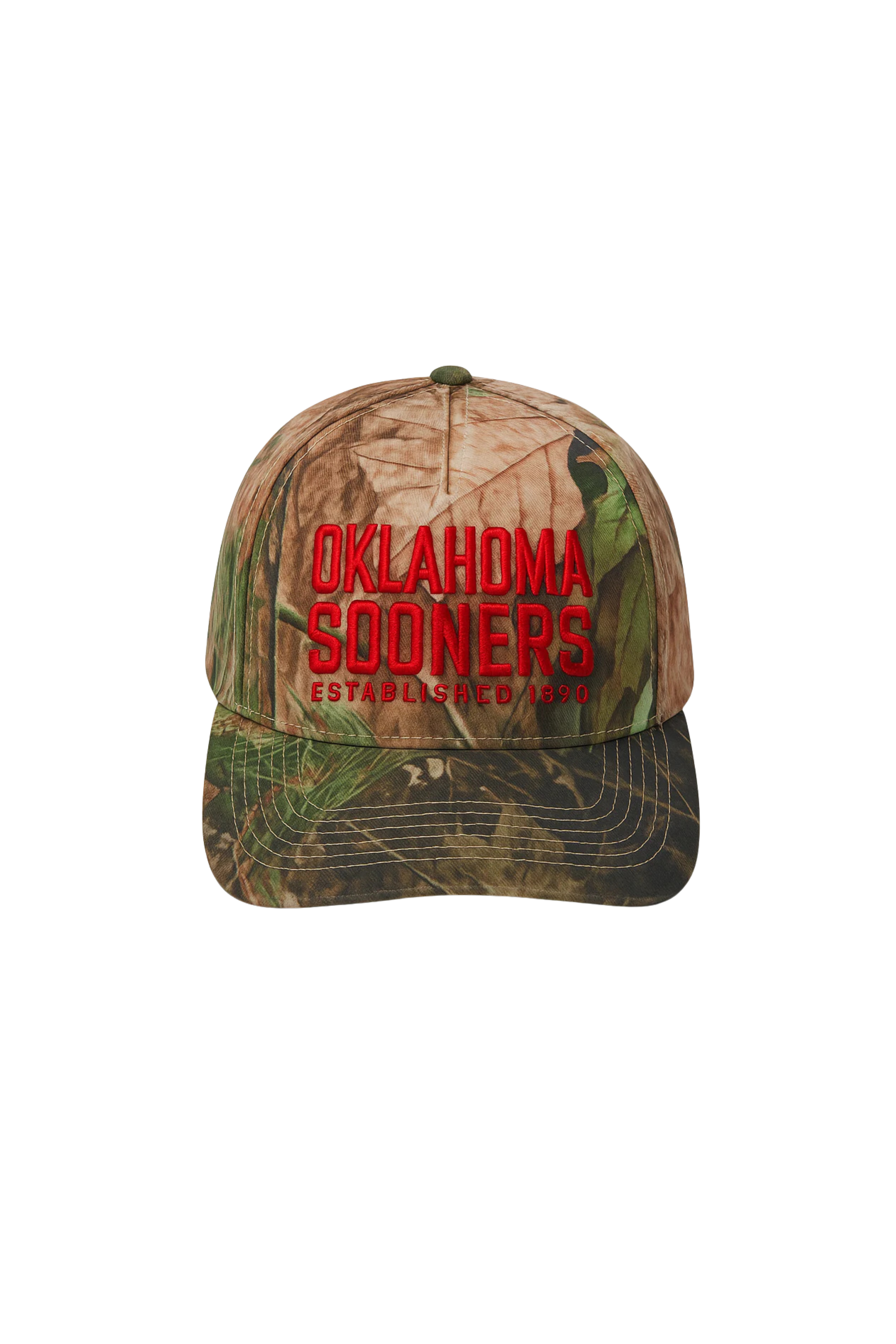 Rep your team with a little southern edge in the Sooners Camo Hat. This game-day essential combines classic camo print with bold red embroidered Oklahoma Sooners lettering across the front. The structured fit and curved brim give it that timeless, sporty feel while the adjustable back ensures all-day comfort — perfect for tailgates, stadium seats, or casual weekends around town.