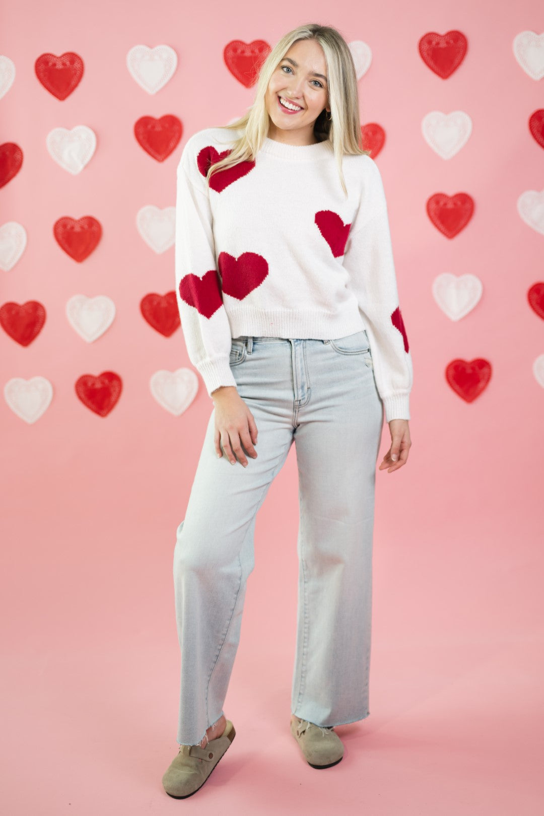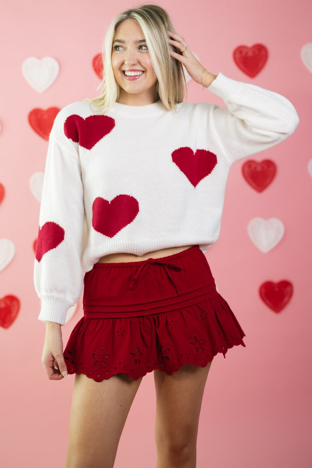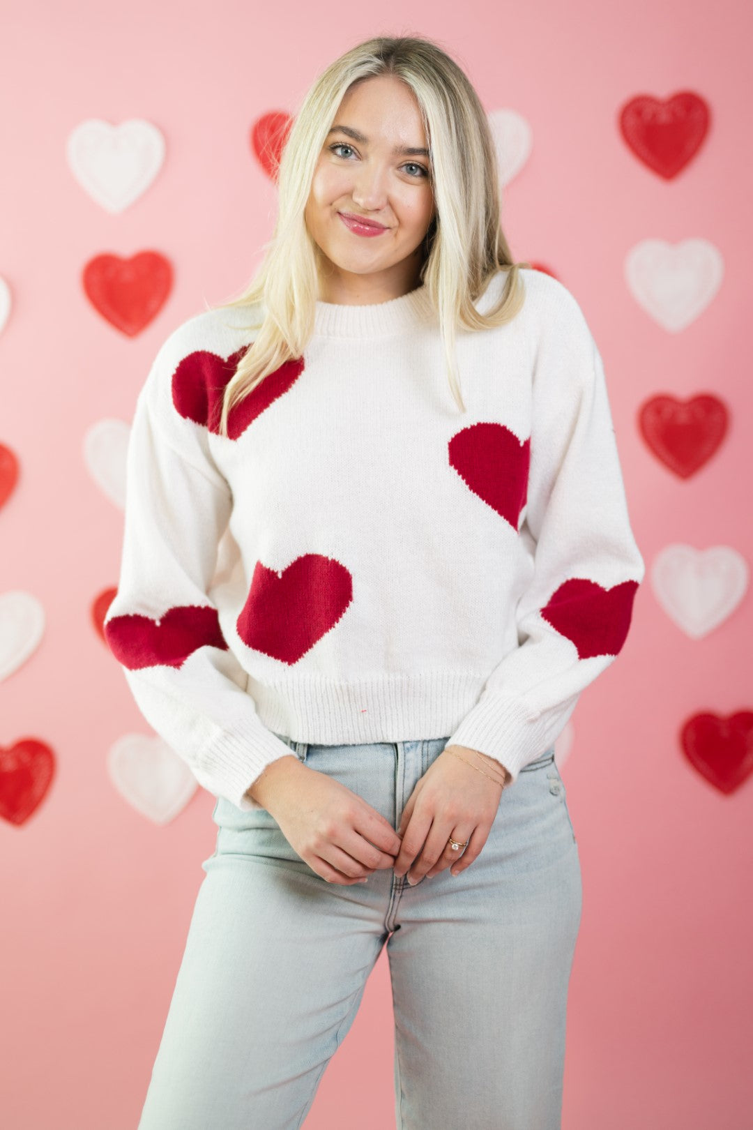 The Amour Sweater is a Valentine’s-ready knit that feels playful without being over-the-top. Featuring bold red heart motifs scattered across a soft cream base, this sweater has an easy, relaxed fit that works just as well for casual date nights as it does for everyday wear.
