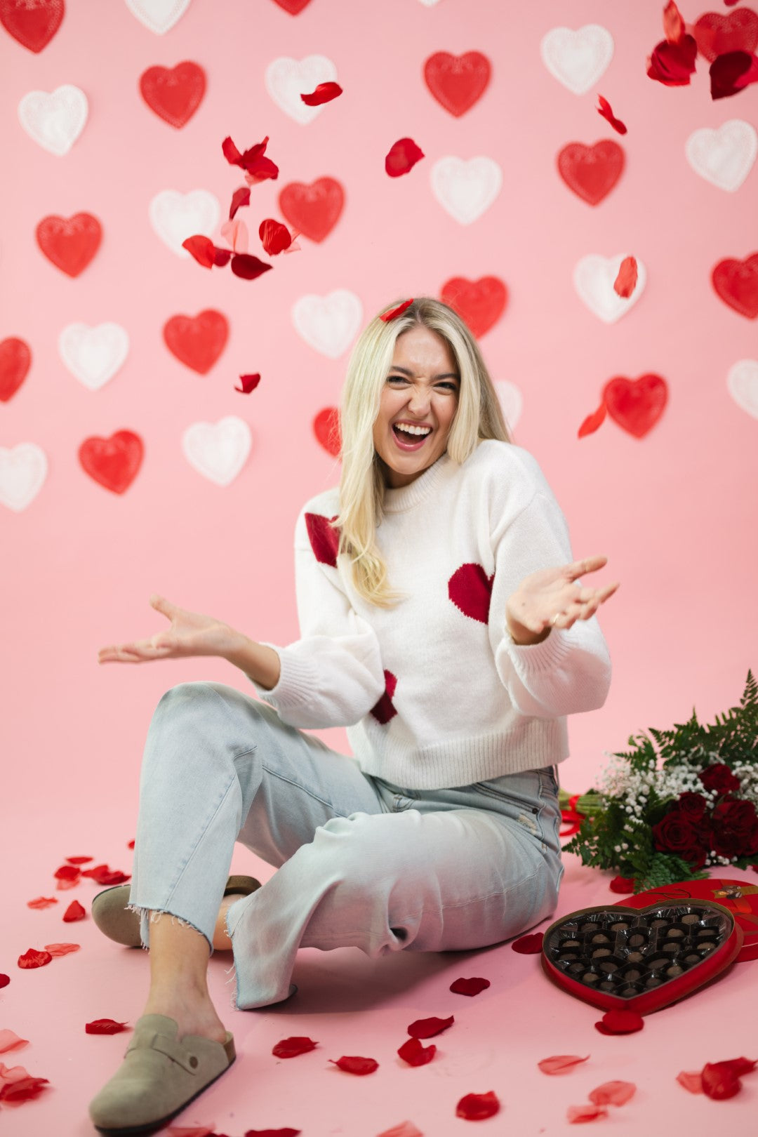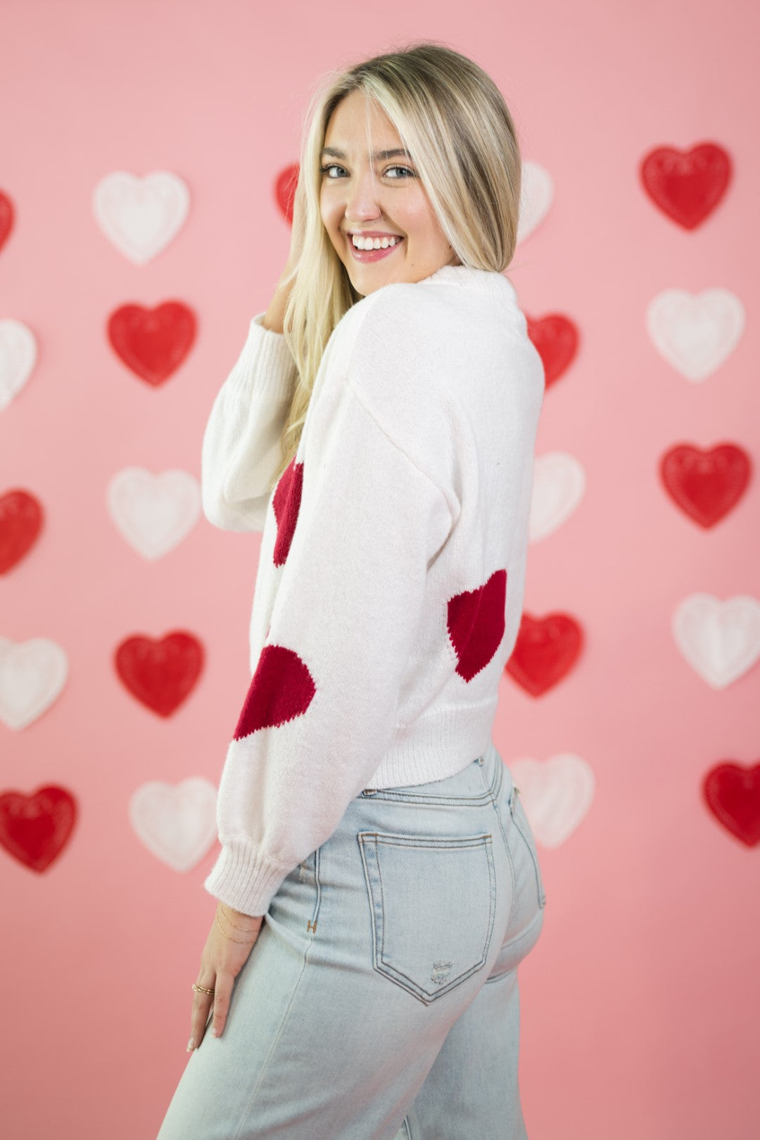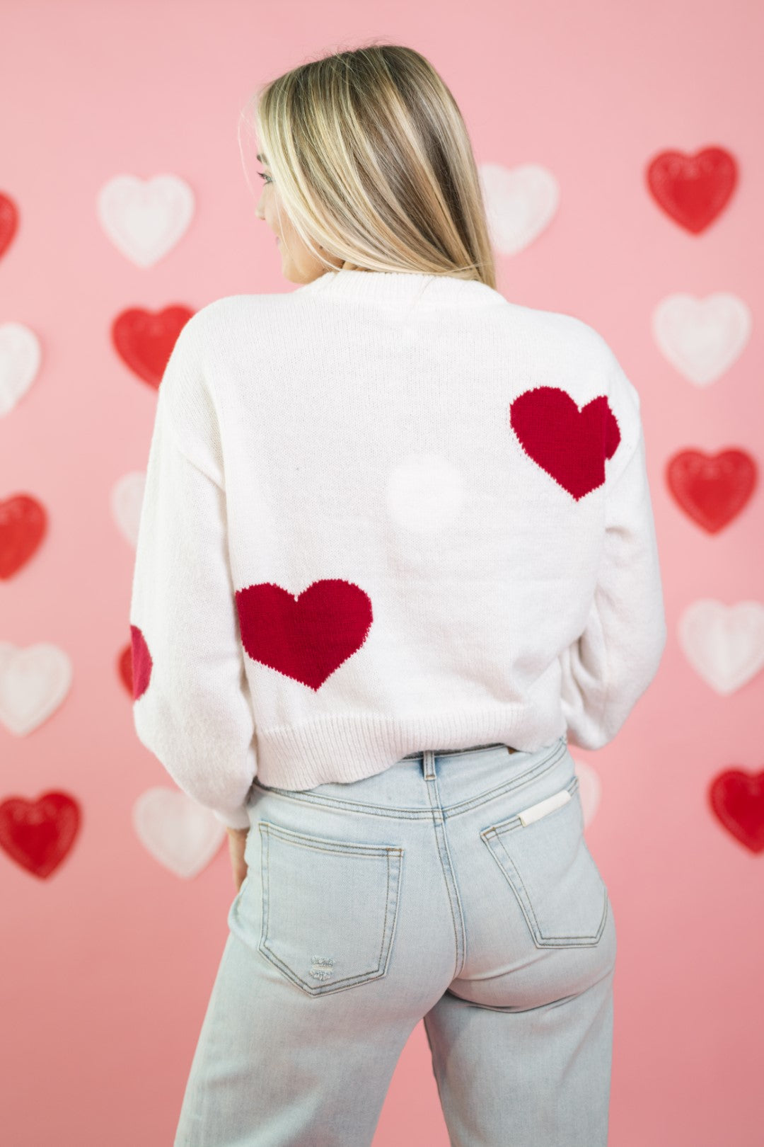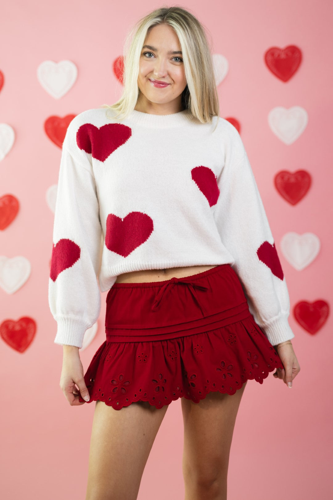 The Amour Sweater is a Valentine’s-ready knit that feels playful without being over-the-top. Featuring bold red heart motifs scattered across a soft cream base, this sweater has an easy, relaxed fit that works just as well for casual date nights as it does for everyday wear.